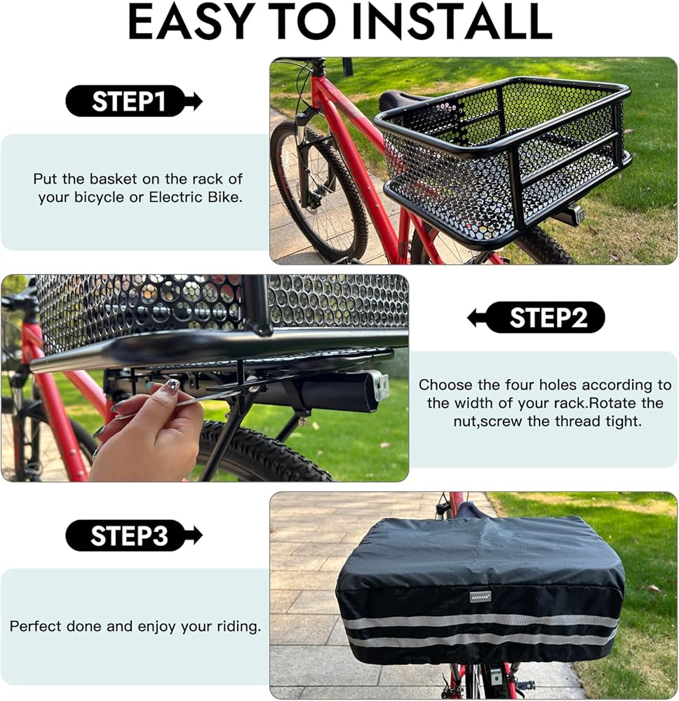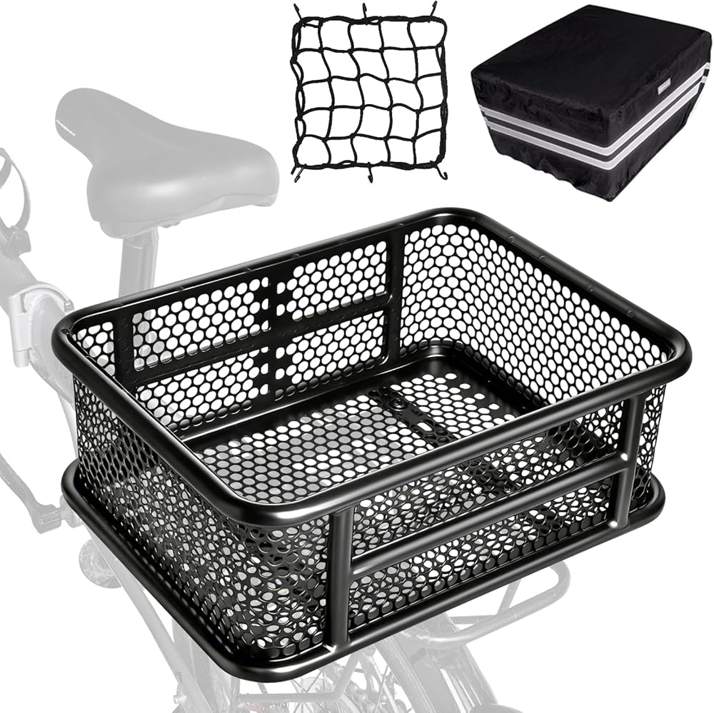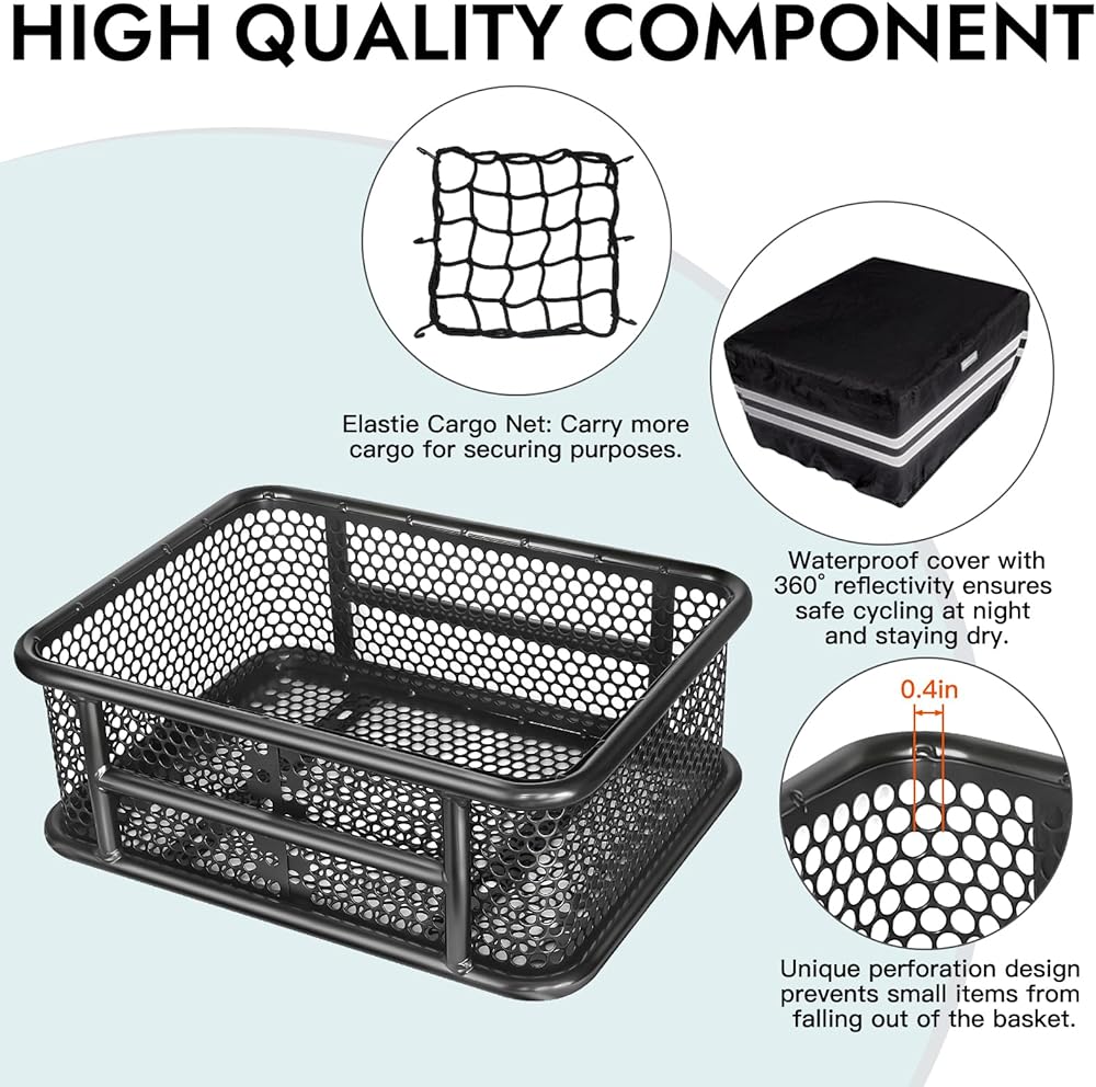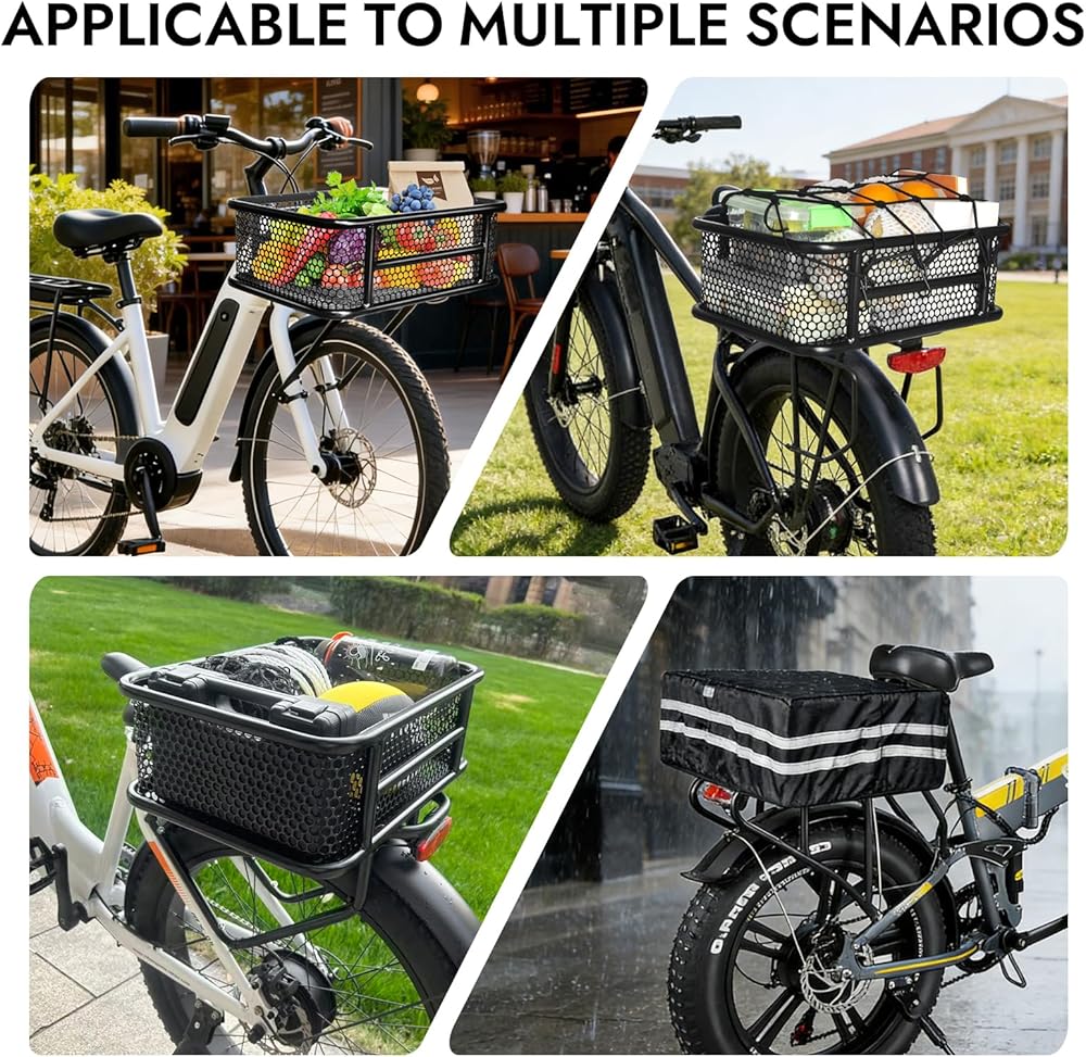 سلة دراجة RAYMACE خلفية مع غطاء عاكس مقاوم للماء وشبكة شحن، سلة دراجة كبيرة بتصميم مثقوب تناسب الدراجة الكهربائية، مثبتة على الرف الخلفي أو الأمامي - في انتظار الحصول على براءة اختراع