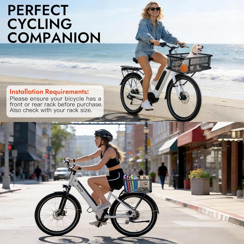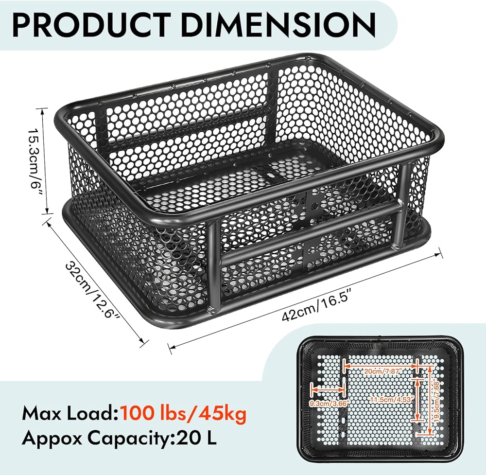 • سعة كبيرة 25 لتر: الأبعاد الخارجية للسلة الخلفية للدراجة هي 16.5 بوصة طول × 12.6 بوصة عرض × 6 بوصة ارتفاع. إنها توفر مساحة إضافية وراحة عند الركوب. مثالية لحمل البقالة وحقائب الظهر وقضبان الصيد والكلاب الصغيرة.