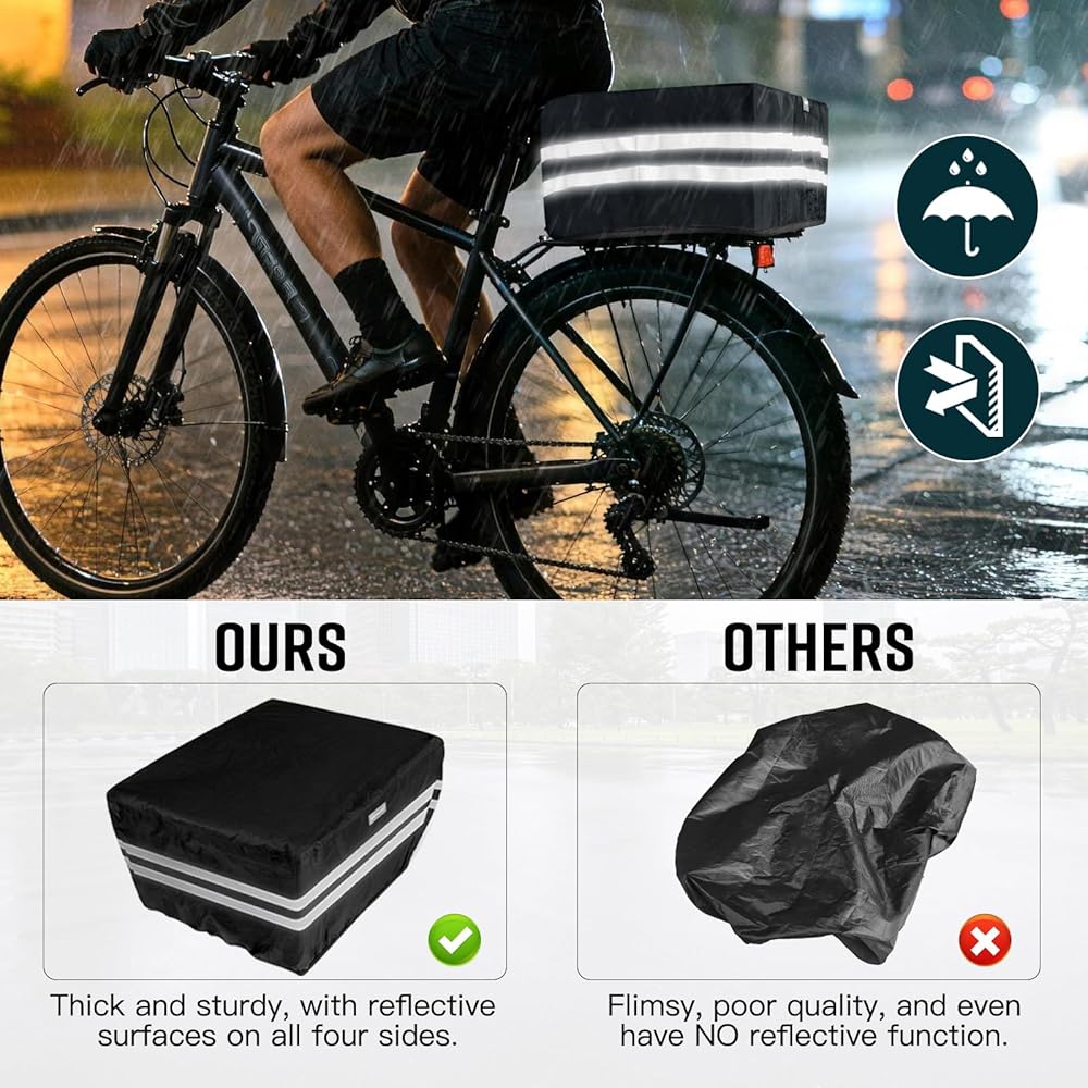 • مجموعة الملحقات: تشتمل على غطاء عاكس مضاد للمطر من أربعة جوانب، مما يعزز السلامة في الليل، مما يجعلها مرئية ومميزة للغاية. شبكة شحن مرنة تعمل على تأمين أغراضك وتمنعها من السقوط. (الحامل غير متضمن)