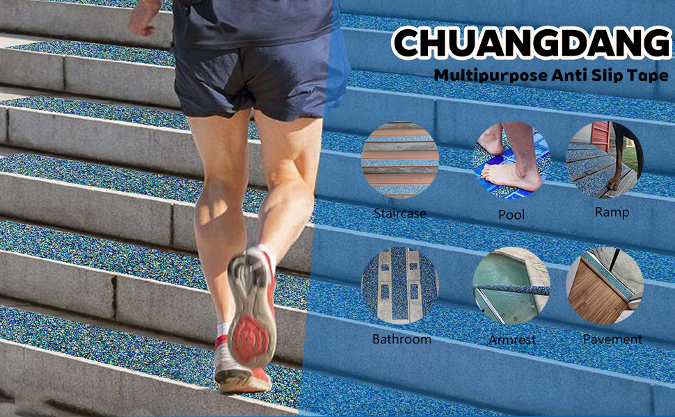 مساعد السلامة لك ولعائلتك: يمكن للشريط المطاطي الأزرق المضاد للانزلاق CHUANGDANG الحفاظ على قوة جيدة ضد الانزلاق عند استخدامه في الداخل والخارج على السلالم والخطوات والطرق. مناسب جدًا للعائلات التي لديها كبار السن والأطفال والحيوانات الأليفة، لمنع السقوط أثناء المشي وصعود ونزول الدرج والاستحمام. لتجنب الانزلاق والسقوط في أوقات مختلفة، مما يضمن سلامة عائلتك.