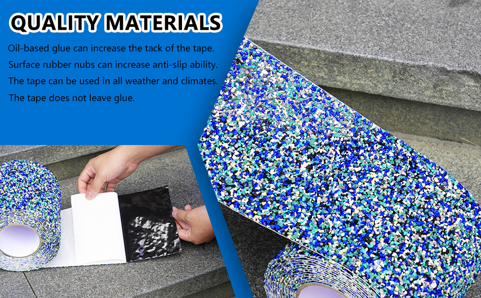 الحجم والمواد الخام: سطح الشريط المطاطي الأزرق المضاد للانزلاق CHUANGDANG يحتوي على نتوءات مطاطية غير متساوية، مما يزيد من الاحتكاك وقوة الشريط المضادة للانزلاق. الحجم هو 2 بوصة × 16.5 قدم، لفة واحدة، المادة الخام الرئيسية لهذا الشريط المضاد للانزلاق لحمام السباحة هي حبيبات مطاط PEVA + طبقة PVC + أكريليك، حبيبات مطاط PEVA صديقة للبيئة، الأكريليك لزج للغاية، يمكن أن يبقى لزجًا لفترة طويلة ولن يسقط، ولن يكون هناك أي بقايا عند الاستخدام.