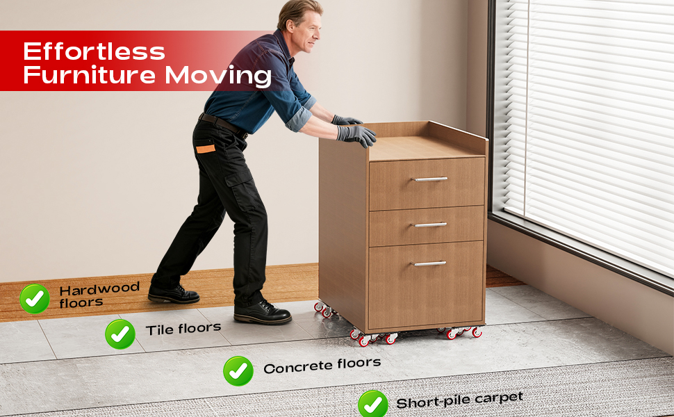 تستخدم على نطاق واسع: بكرات الأثاث مناسبة للمنازل والمكاتب وغيرها من المواقف التي تتطلب نقل الأثاث أو الأجهزة الثقيلة - مثل الأسرة والأرائك والطاولات والثلاجات والغسالات والبيانو وغيرها من العناصر الكبيرة أو كبيرة الحجم. تنزلق بكرات الأثاث بسلاسة على الأرضيات الخشبية وأرضيات البلاط والسجاد منخفض الوبر. ملحوظة: استخدم العربة المتحركة الثقيلة على سطح مستو. لا ينصح به للأسطح ذات الاحتكاك الكبير.