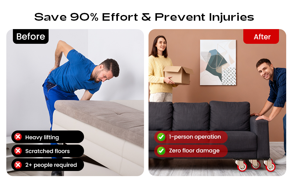 قم بتحريك العناصر الثقيلة دون عناء وتقليل خطر الإصابة: مع دمية الأثاث شديدة التحمل، يمكنك تحريك الأثاث الثقيل دون عناء لإعادة ترتيبه أو تنظيفه في منزلك أو مكتبك. يساعد على حماية ظهرك وخصرك من الإجهاد بينما يحمي أرضياتك أيضًا من الخدوش والأضرار. من السهل على شخص واحد تشغيل ناقلات الأثاث الثقيلة ذات العجلات. حتى السيدات وكبار السن يمكنهم بسهولة تشغيل عجلات نقل الأثاث.