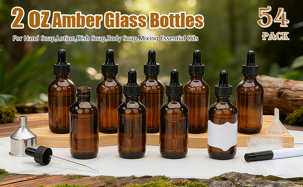 يتضمن المنتج: 54 زجاجة قطارة، 1 قمع صغير من الفولاذ المقاوم للصدأ، 3 أقماع بلاستيكية، 3 فرش تنظيف، 8 ملصقات بيضاء، وقلم أسود واحد.