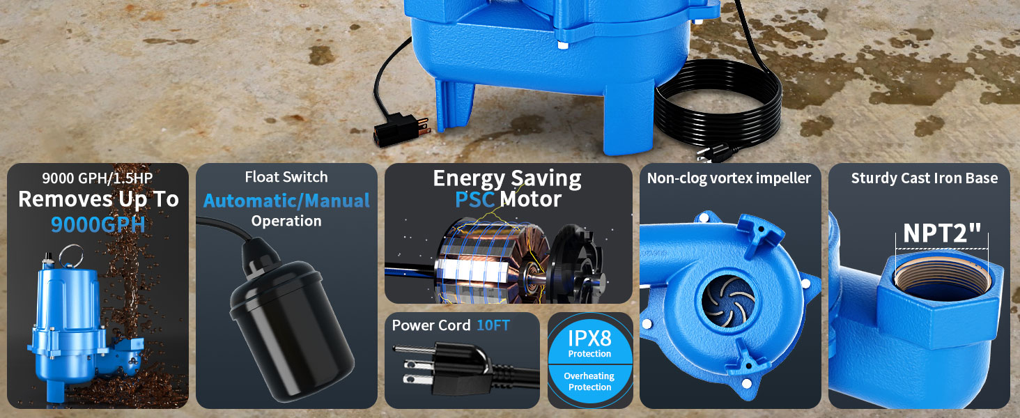• مضخة مياه الصرف الصحي عالية الكفاءة 9000 جيجا في الساعة: مجهزة بمحرك PSC بقوة 1.5 حصان، وتضمن مضخة طاحونة الصرف الصحي أداءً قويًا. يمكن لمضخة الصرف الصحي ضخ ما يصل إلى 9000 جالون في الساعة وسترفع المياه حتى 29 قدمًا من الارتفاع الرأسي. توفير الطاقة والتشغيل الهادئ يجعلها مثالية للأقبية وأحواض الحوض وتطبيقات خزانات الصرف الصحي