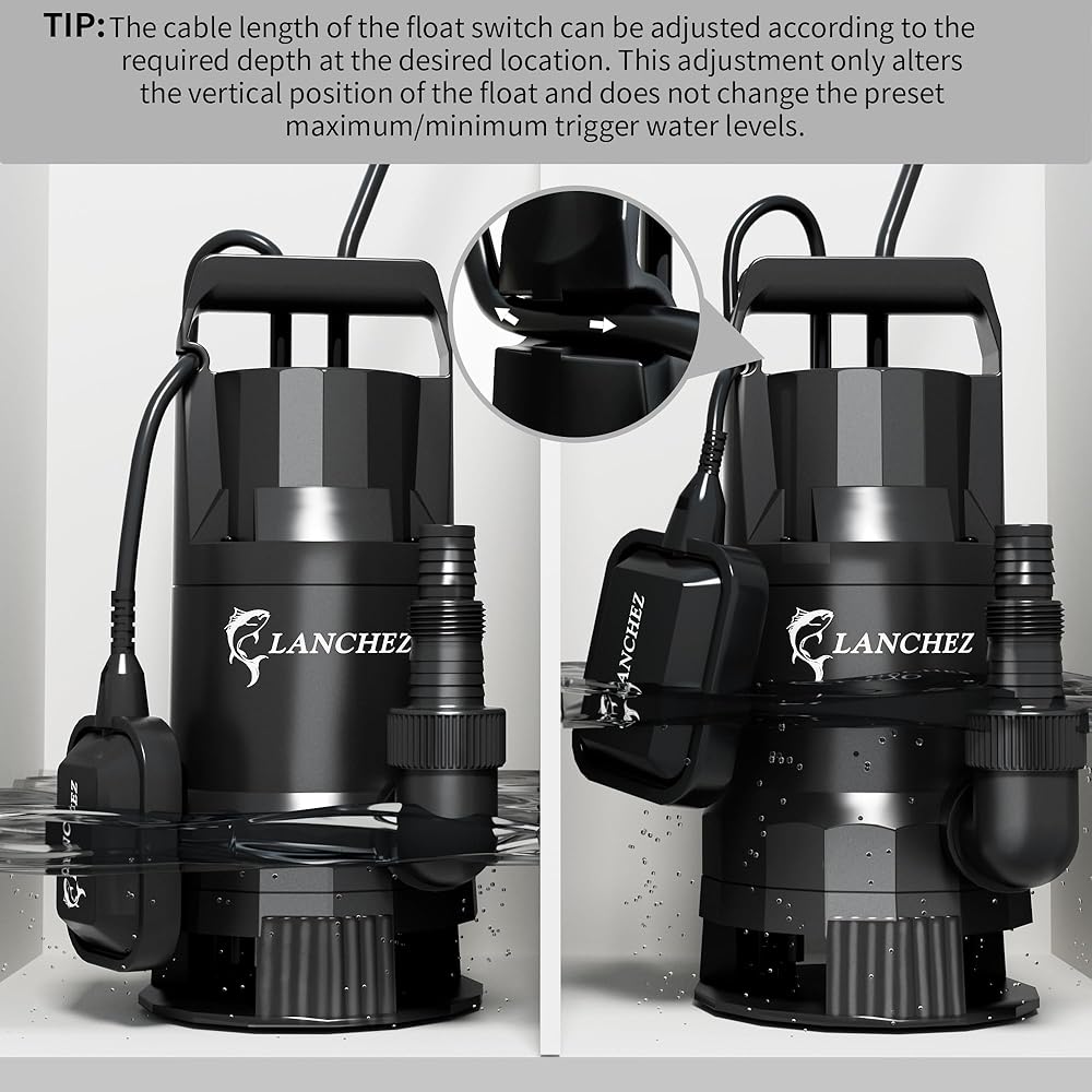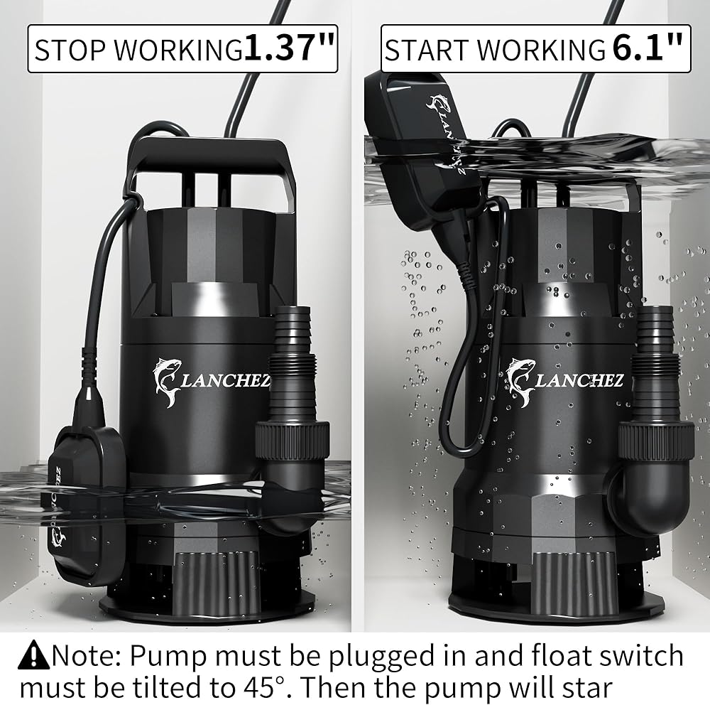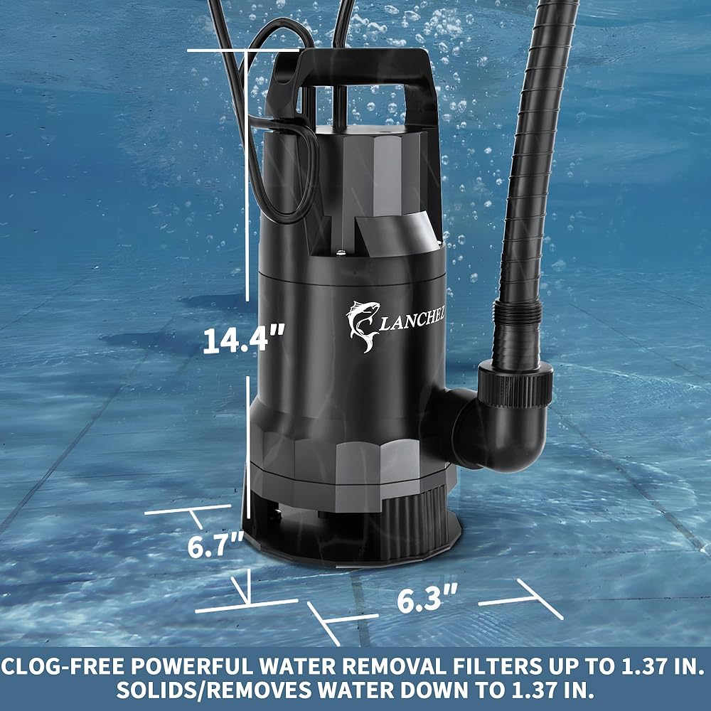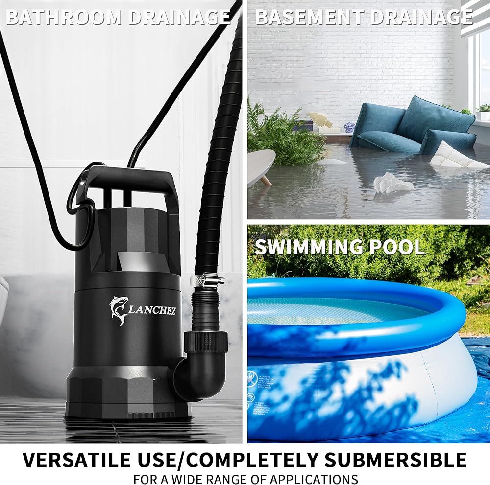 مضخة مستنقع LANCHEZ 1.6HP 6000GPH، مضخة مياه غاطسة عالية التدفق مع مفتاح تعويم، مضخة مياه نقل أوتوماتيكية لحوض السباحة في الطابق السفلي من حوض الصرف الصحي، أسود