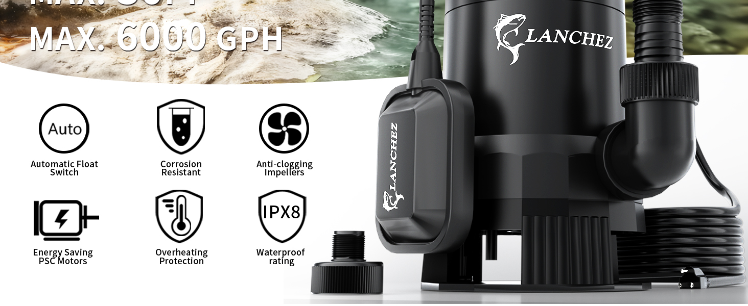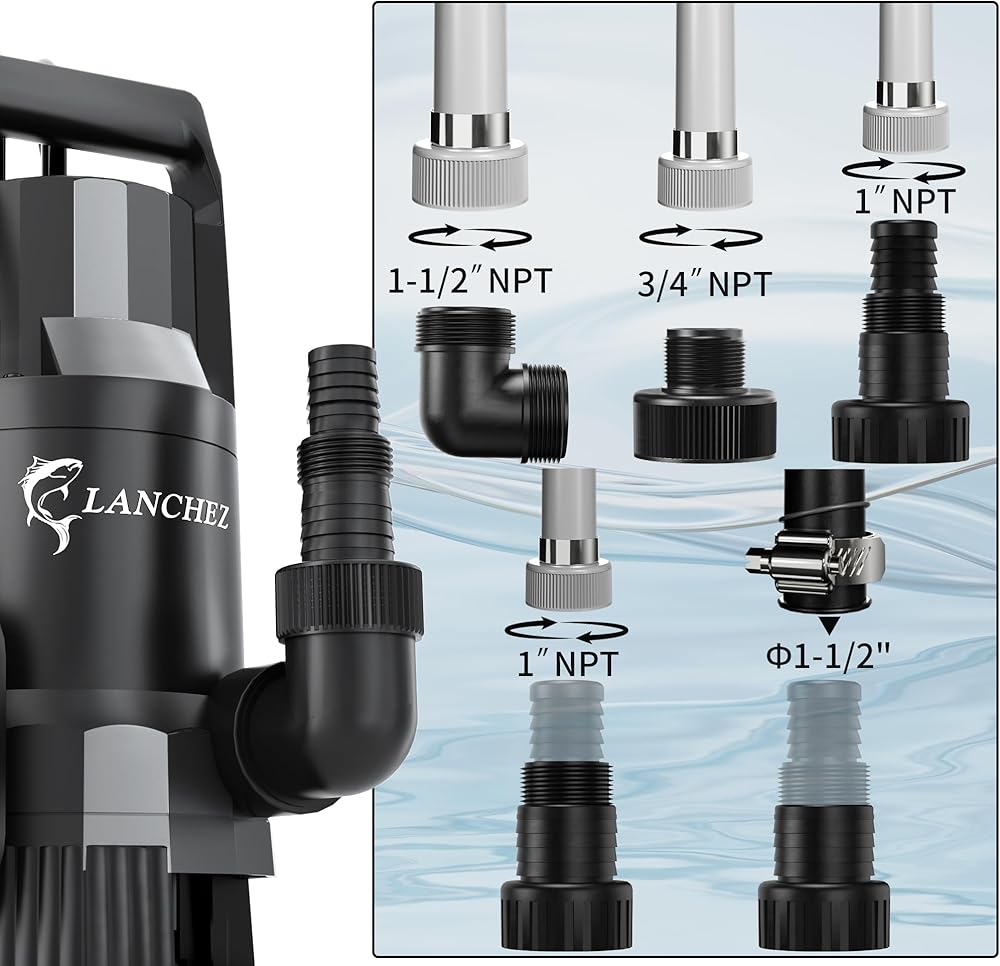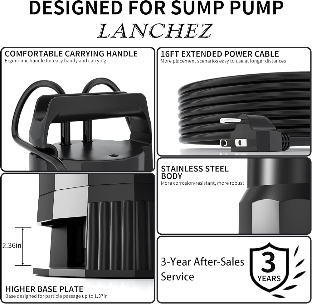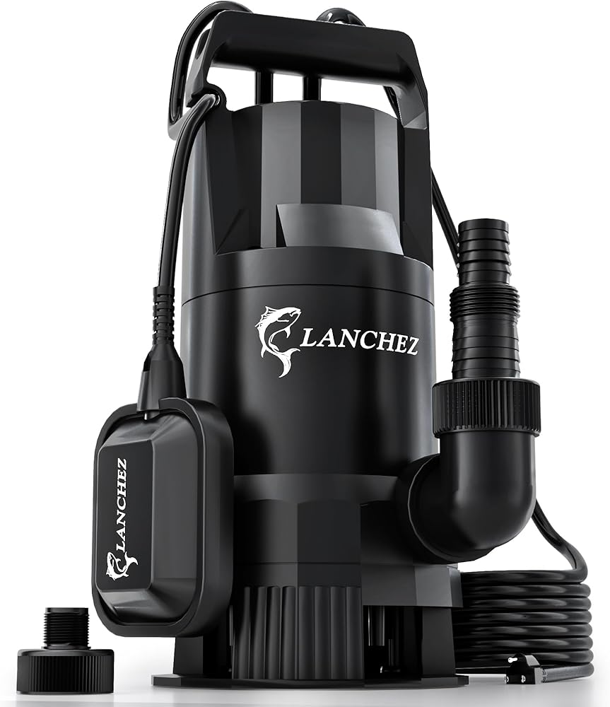 مضخة مستنقع LANCHEZ 1.6HP 6000GPH، مضخة مياه غاطسة عالية التدفق مع مفتاح تعويم، مضخة مياه نقل أوتوماتيكية لحوض السباحة في الطابق السفلي من حوض الصرف الصحي، أسود