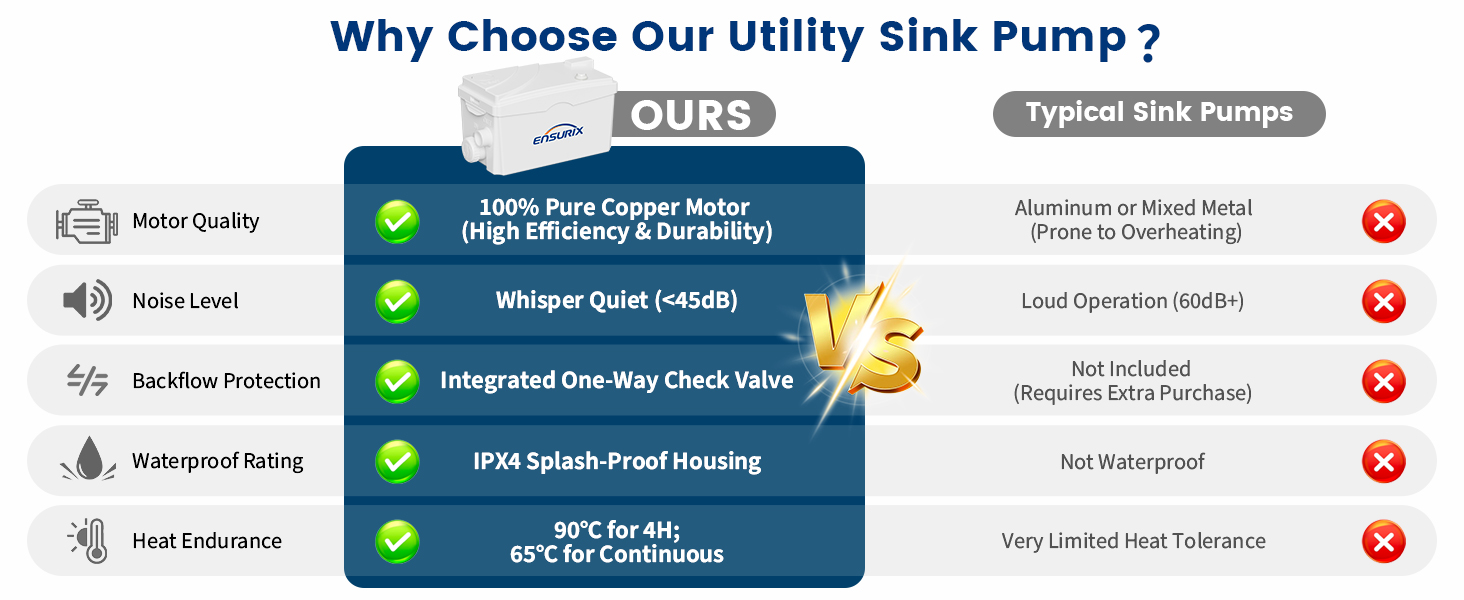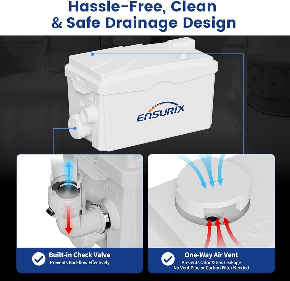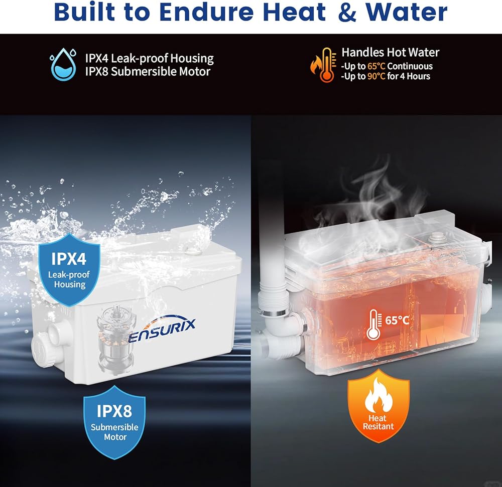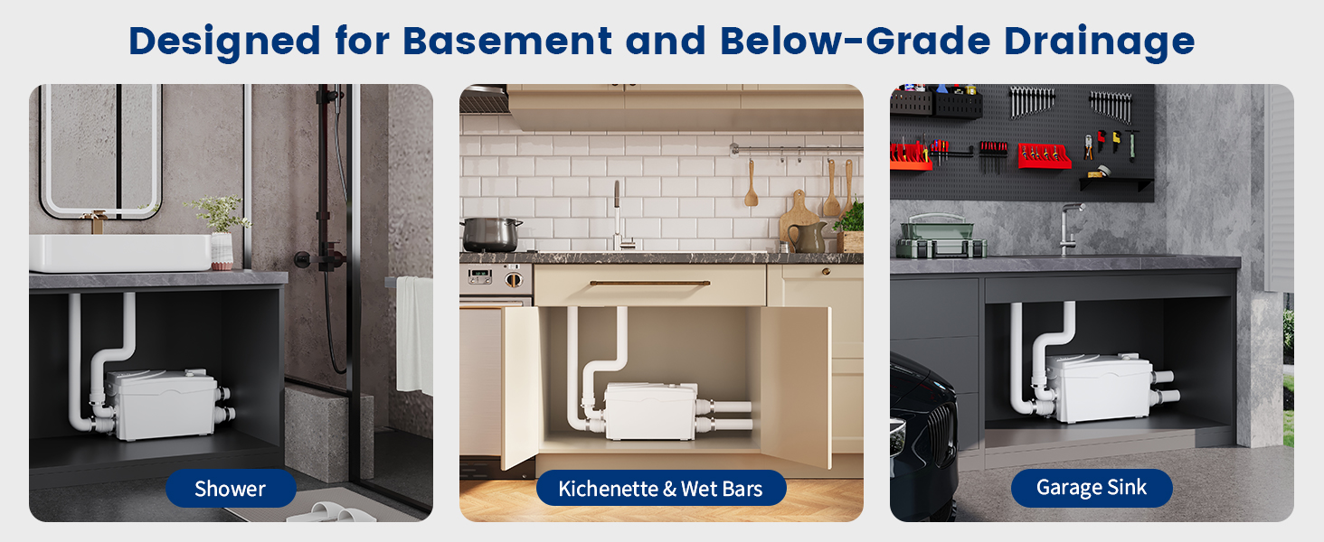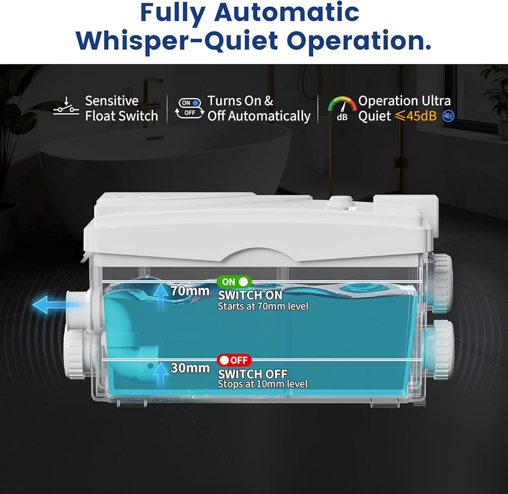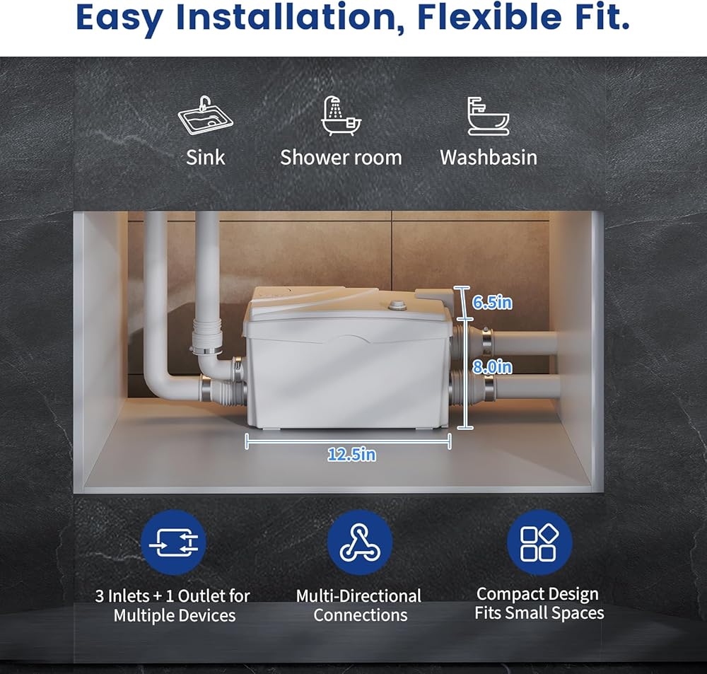 • تركيب مضخة مدمجة تحت الحوض - مع مظهر نحيف (12.5 بوصة × 8 بوصة × 6.5 بوصة)، تتناسب هذه المضخة بسهولة مع المساحات الضحلة. وتتميز بثلاثة مداخل عالمية بقطر 40 مم ومنفذ واحد، مما يسمح بوصلات متعددة الاستخدامات للمطبخ أو الطابق السفلي أو الدش.