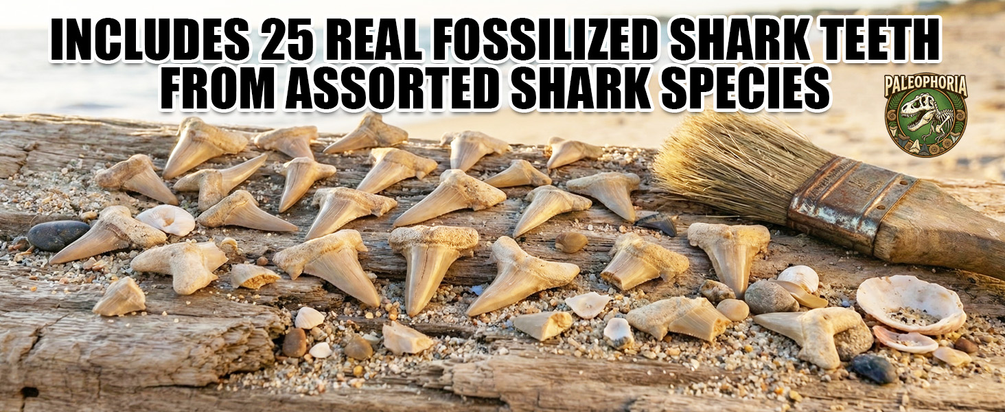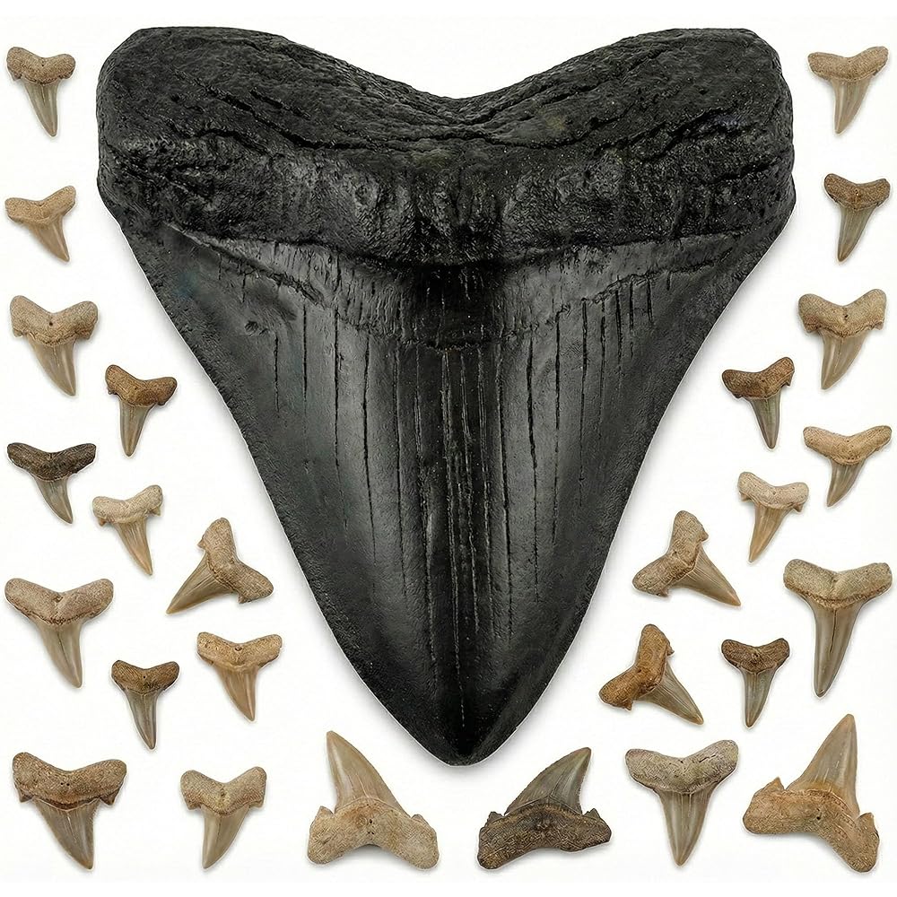 تتضمن 25 سنًا من أسنان القرش المتحجرة الحقيقية من أنواع متعددة - تحتوي كل مجموعة على أسنان قرش أحفورية أصلية وأصلية مصدرها رواسب ما قبل التاريخ. تتميز بمزيج من الأنواع مثل الماكو والثور والليمون والنمر والأسلاف البيض العظماء - كل مجموعة فريدة من نوعها.