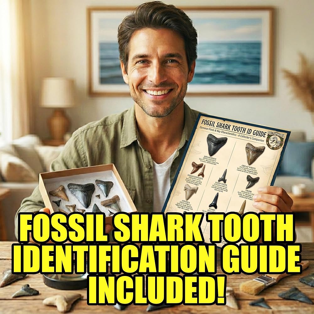يتضمن دليل تعريف أسنان القرش الأحفوري - يأتي مع دليل تعريف أسنان سمك القرش بالألوان الكاملة وسهل القراءة للمساعدة في تحديد الأنواع وأشكال الأسنان والفترات الزمنية. مقدمة ممتعة لعلم الحفريات وعلم الآثار وصيد الحفريات.