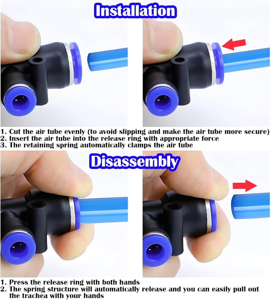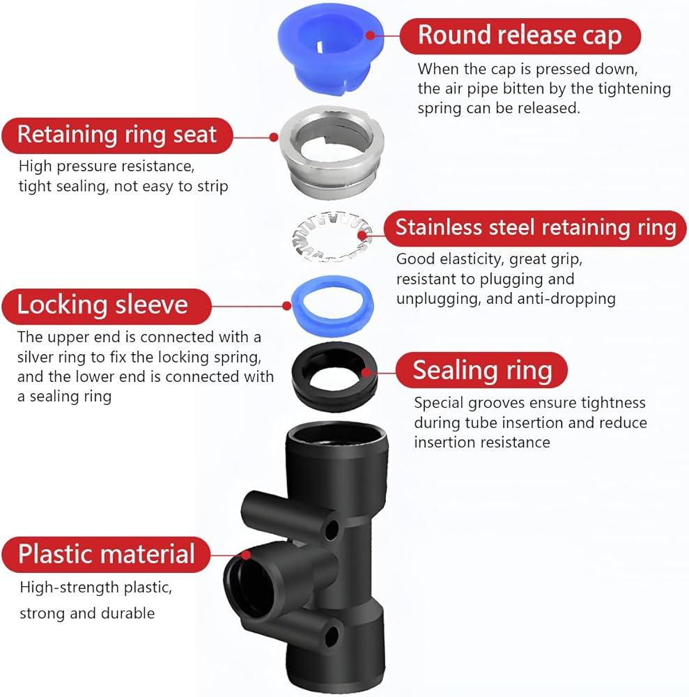 • ★Materials: Sealing O-ring (NBR), Wear-resistant, heat-resistant, and air-leakage-proof; Lock claw: stainless steel (SUS), Good elasticity and resistant to plugging, unplugging and no damage to the trachea; Main body: plastic (PET),Strong and durable, not easy to deform or crack, strong corrosion resistance.