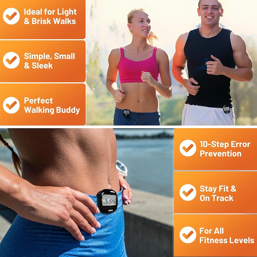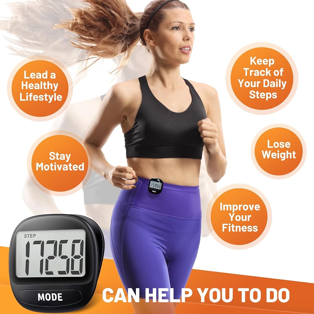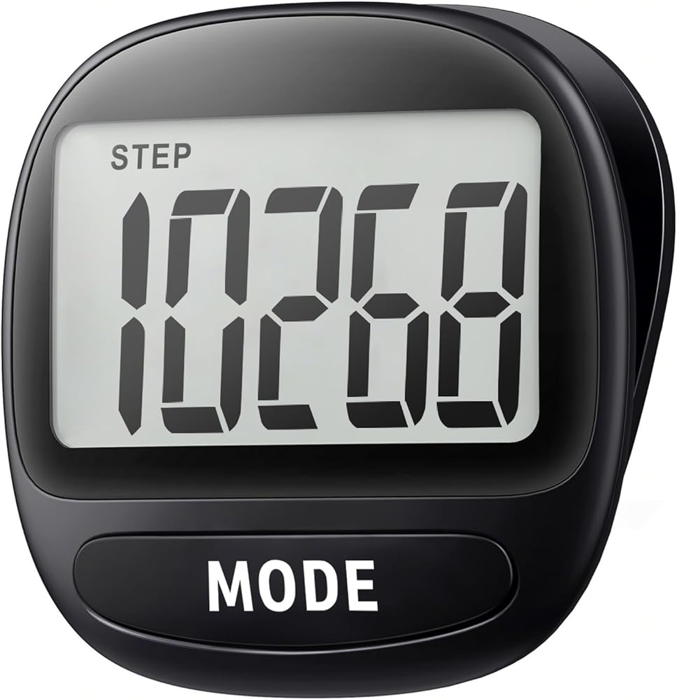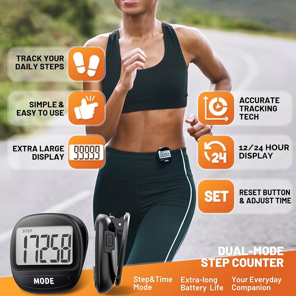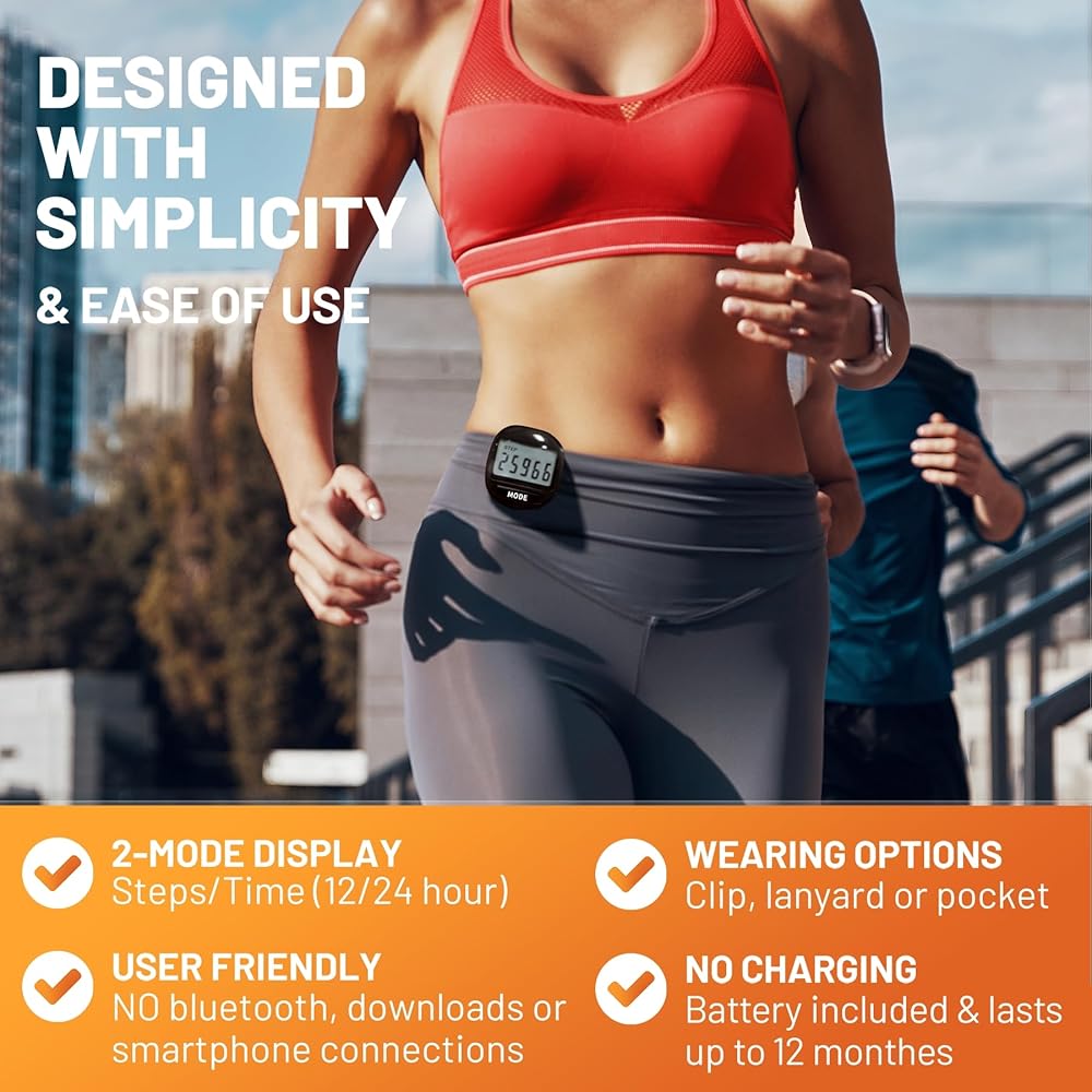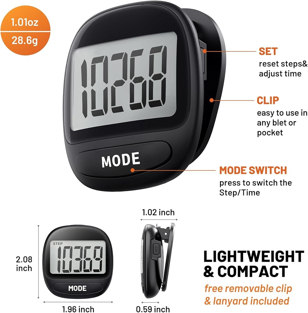 • Clear LCD Display: Our step tracker features an easy-to-read LCD screen that shows step count and time; Simple operation with MODE and SET buttons; NOTE: a low number of steps does not trigger the recording, recording starts after 10 consecutive steps