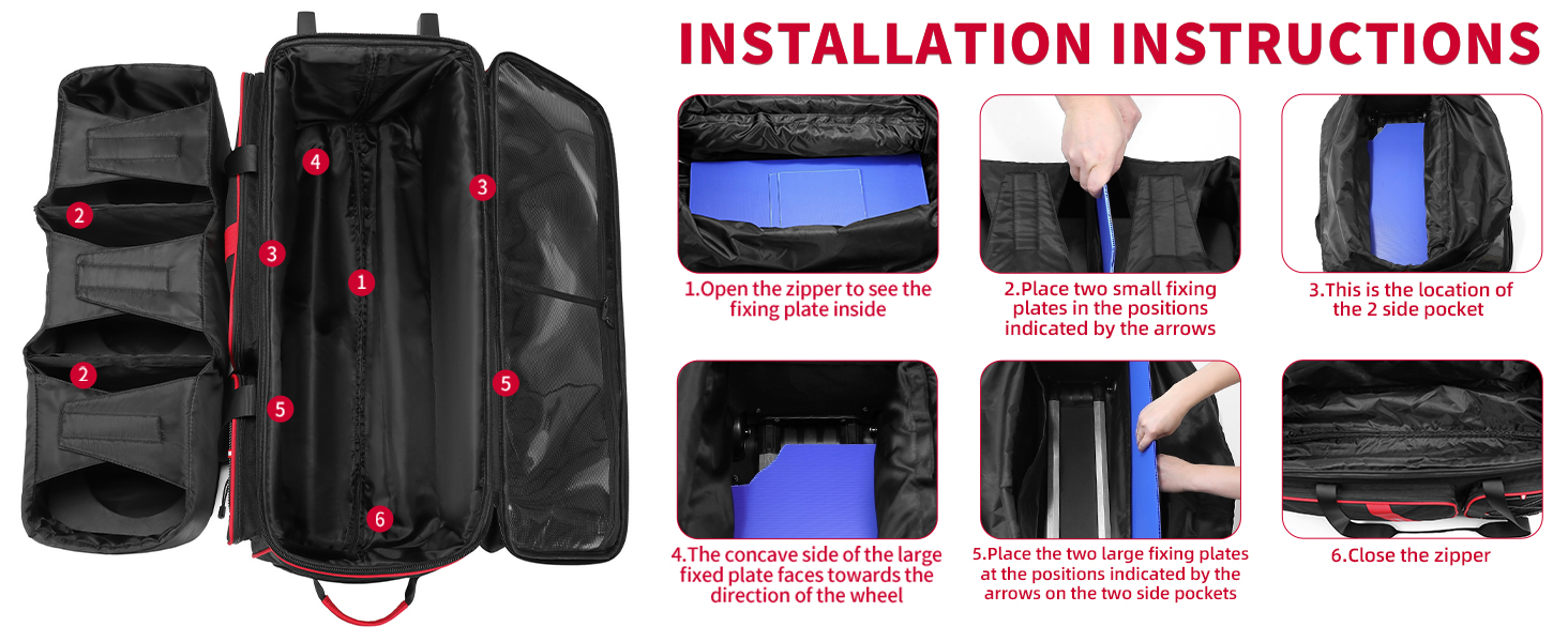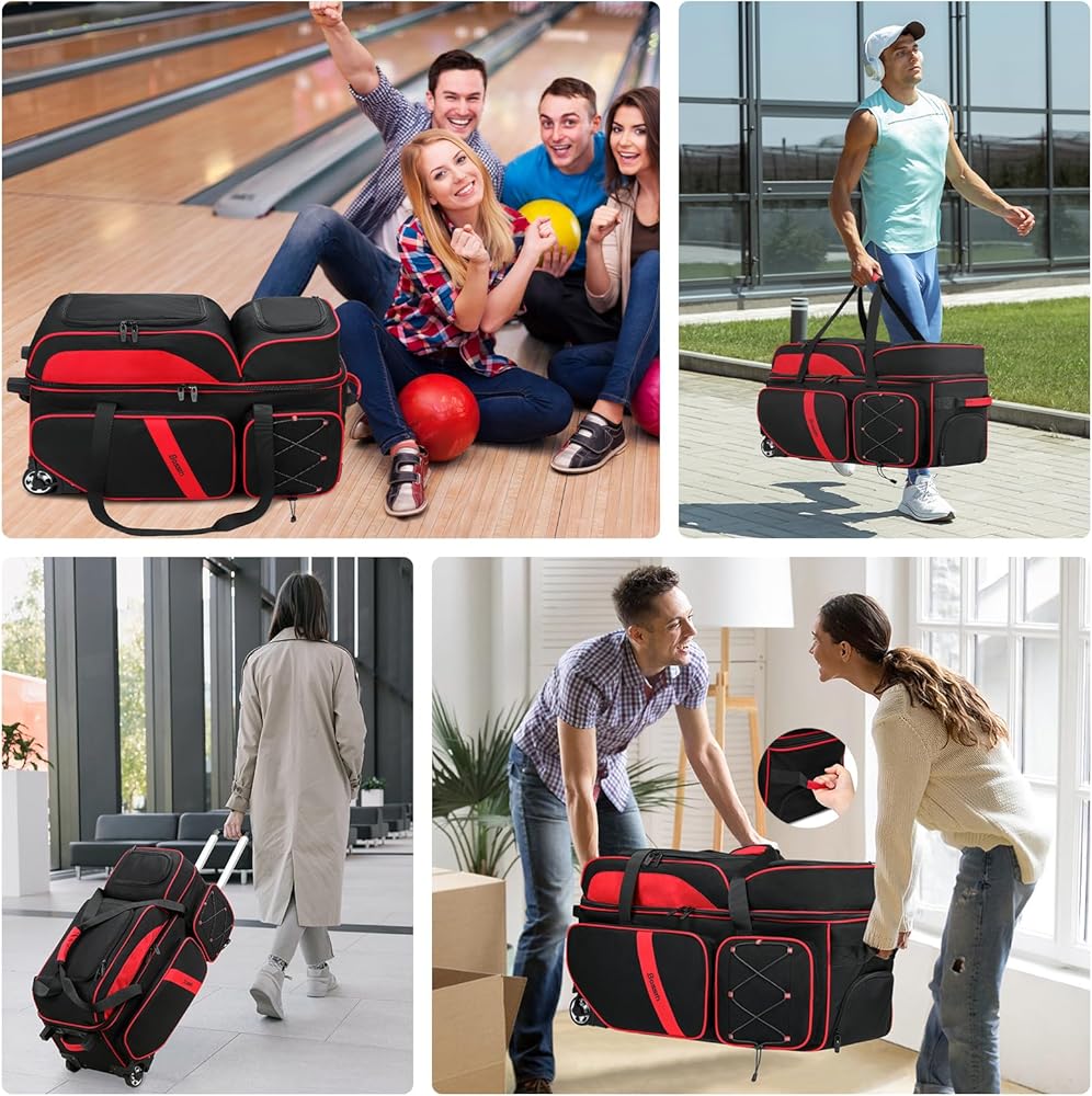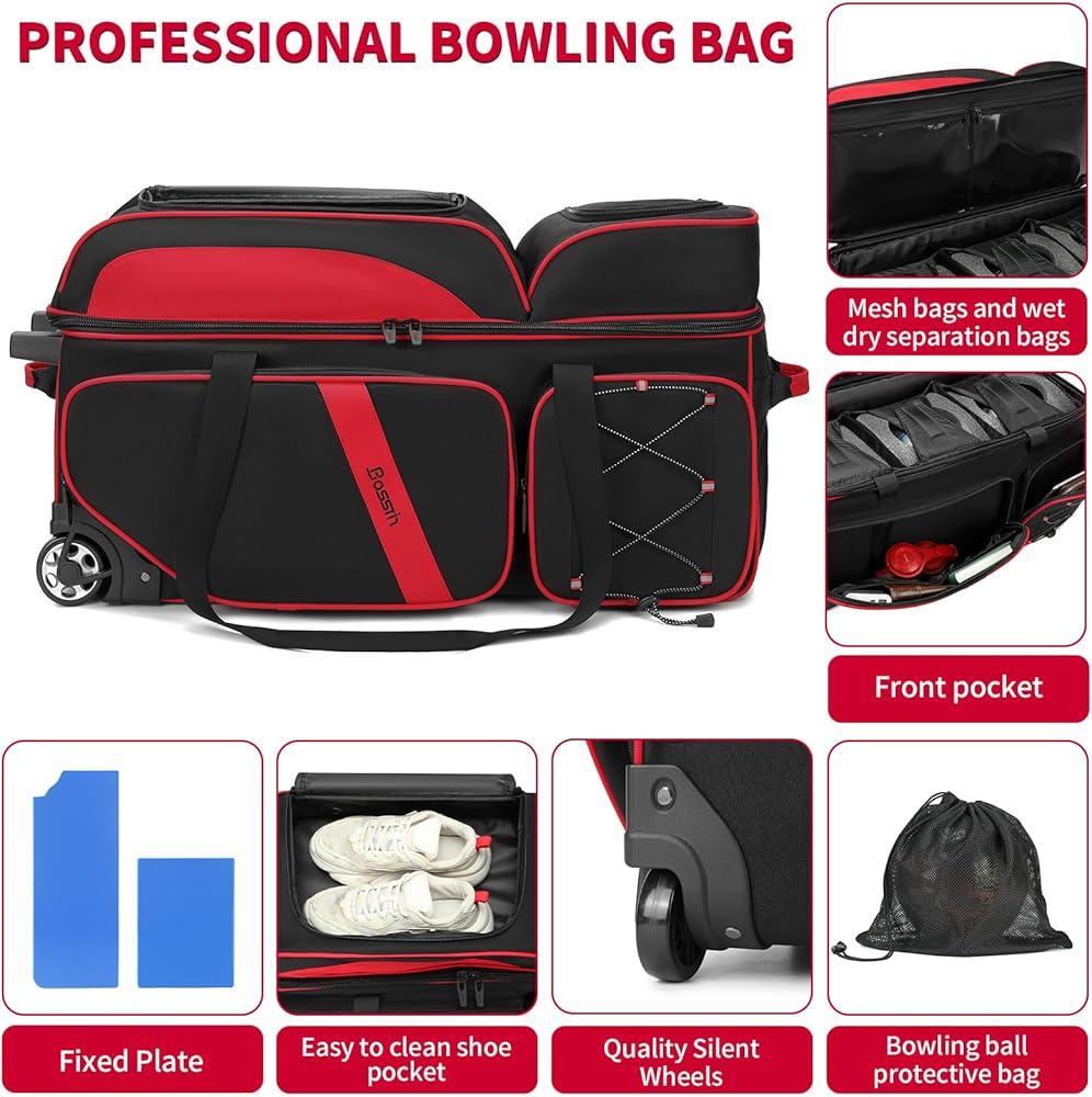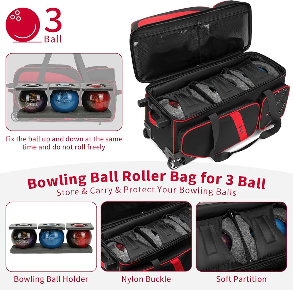 【Smooth Rolling】: Equipped with Quality Silent Wheels, this three ball bowling bag with wheels ensures effortless mobility and maneuverability,The triple bowling ball bag helps you to carry your bowling balls to anywhere easily ,3 ball bowling bag with three mesh pockets for better picking up and protecting your bowling ball