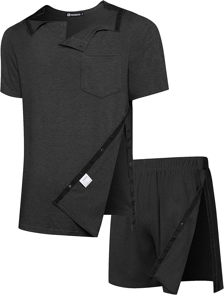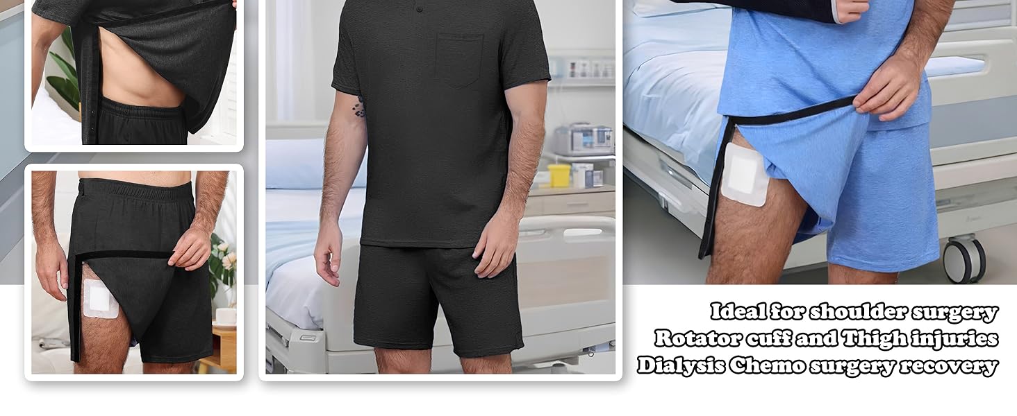 تصميم مفتوح بالكامل - ملابس ملائمة للرجال بعد الجراحة. تشتمل هذه المجموعة على قميص جراحة الكتف للرجال وسروال قصير، وكلاهما مصمم بفتحات جانبية كاملة. باعتبارها ملابس تكيفية حقيقية للرجال، فهي تسمح بارتداء الملابس بسهولة دون رفع الذراعين أو الساقين. مثالية كملابس بعد العمليات الجراحية، خاصة لعمليات جراحية الكفة المدورة، أو الذراع المكسورة، أو التعافي من جراحة الكتف.