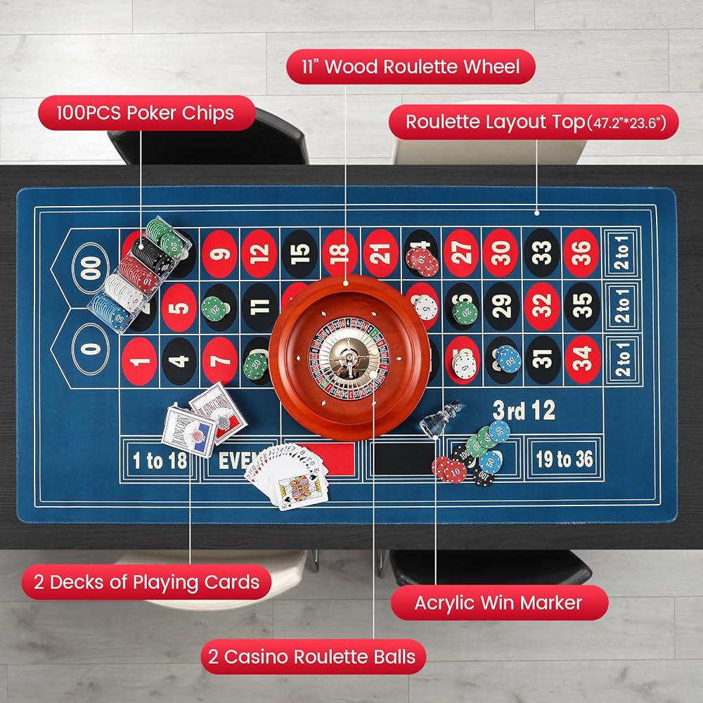[Complete Roulette Experience]: Our roulette wheel set includes everything you need for a thrilling game night: an 11” roulette wheel, a 47.2*23.6” rubber mat, 100 ABS chips, a roulette winner marker, and 2 decks of playing cards. This all-in-one set provides the complete gaming experience right out of the box.
