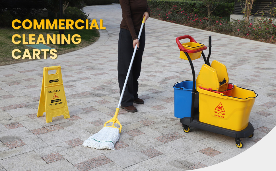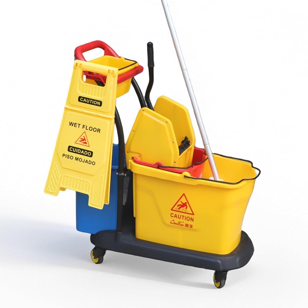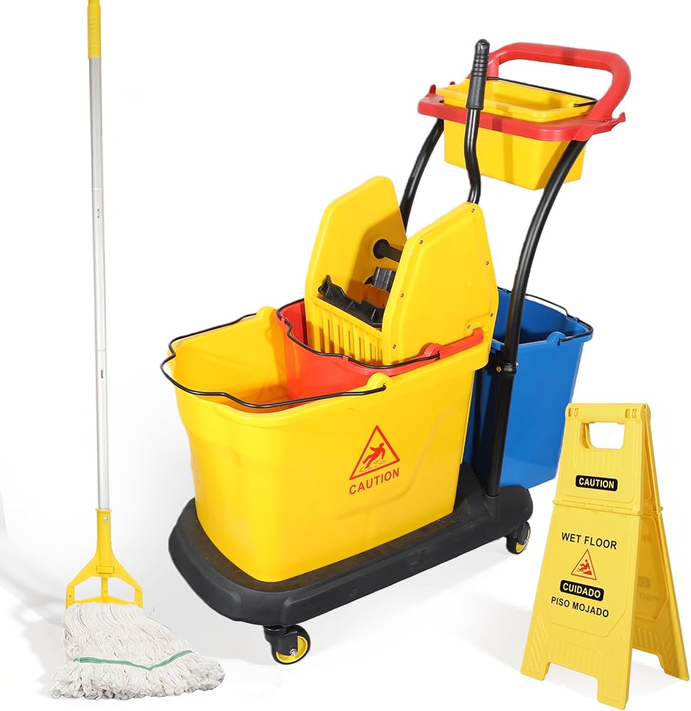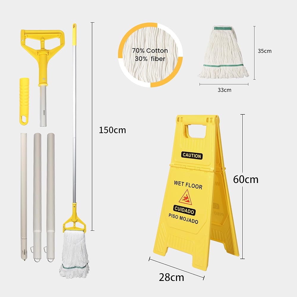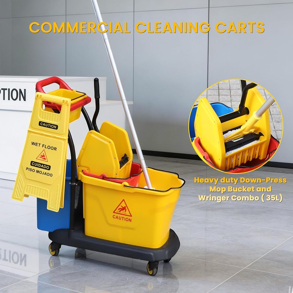 المجموعة الاقتصادية: عربة تنظيف بعجلات + دلو ممسحة تجارية سعة 35 لترًا مع عصارة لأسفل + دلو ماء شفاف سعة 15 لترًا + سلة فوضى سعة 4 لتر + ممسحة تجارية بخيط حلقي + علامة تحذير للأرضيات المبللة (24 بوصة)
