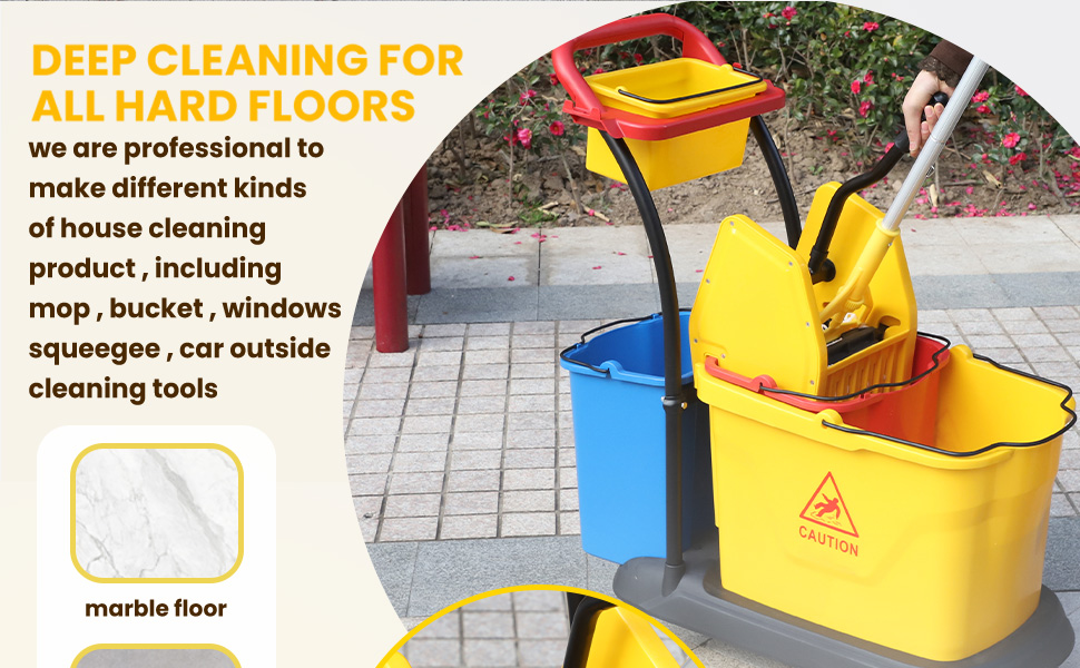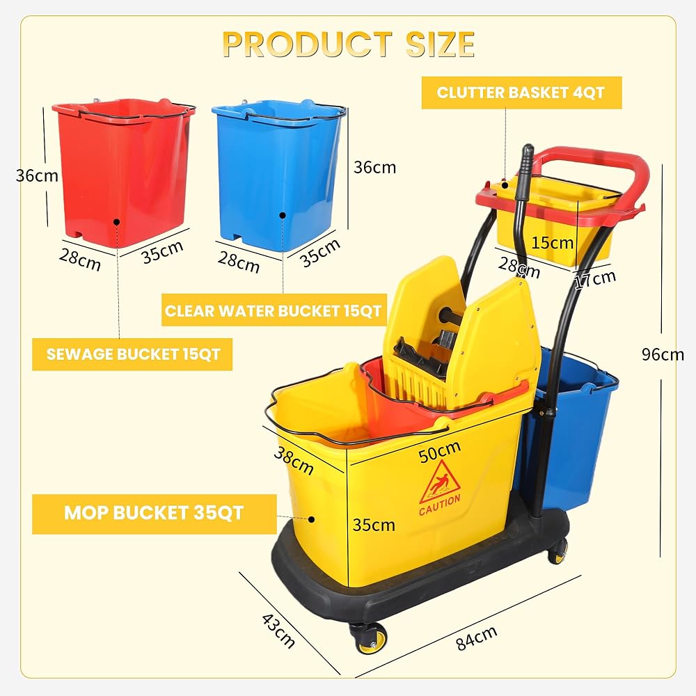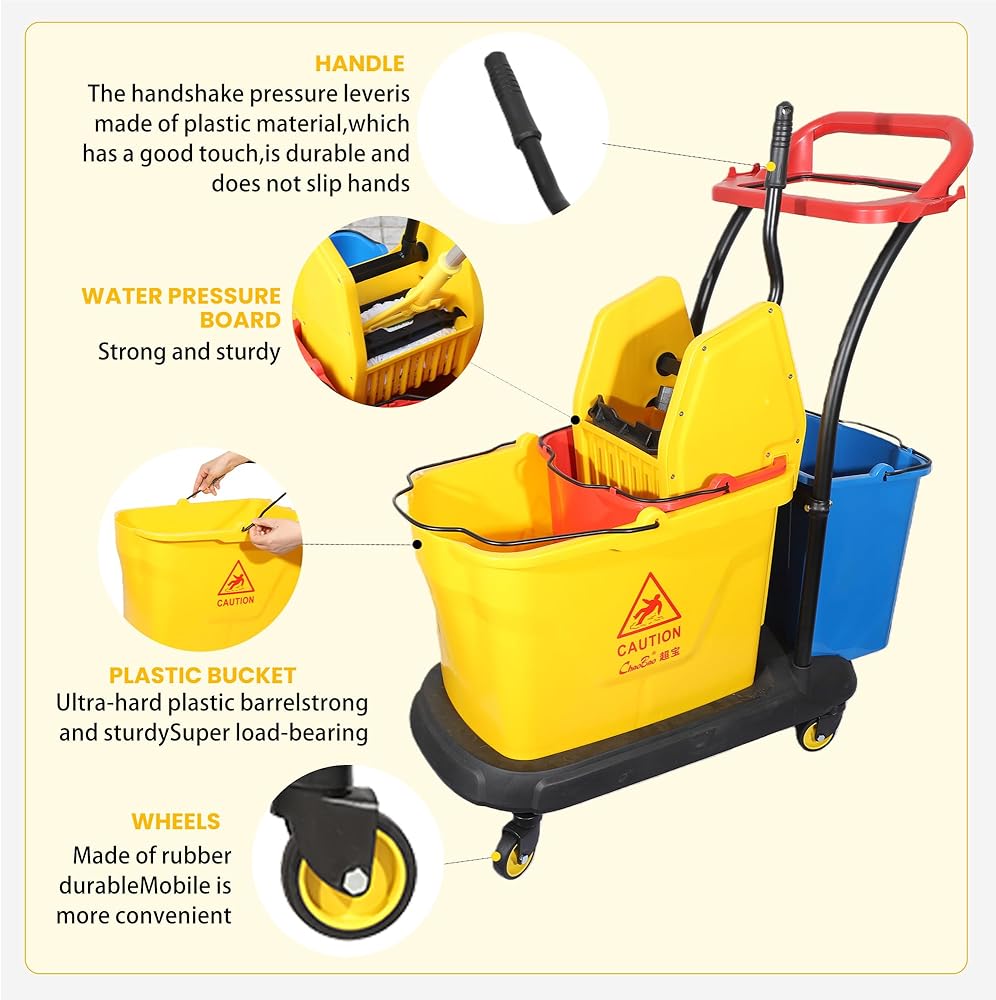 دلو ممسحة مع عصارة: دلو ممسحة بسعة 35 لترًا مع عصارة ضغط سفلية لإخراج المياه المتسخة الزائدة من الممسحة بسهولة، ودلو ممسحة يشتمل على دلو مياه الصرف الصحي سعة 15 لترًا، بحيث يمكن فصل المياه النقية عن المياه المتسخة