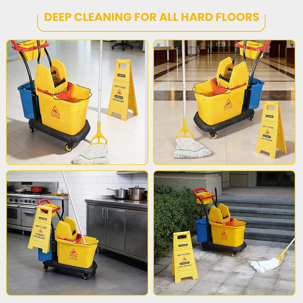 عربة تنظيف تجارية على عجلات، دلو ممسحة مستطيل لتنظيف الأرضيات مع مجموعة عصارة ضغط قوية للأسفل، 38 لتر، أصفر، أضف ممسحة شديدة التحمل وعلامة تحذير للأرضيات المبللة (24 بوصة)