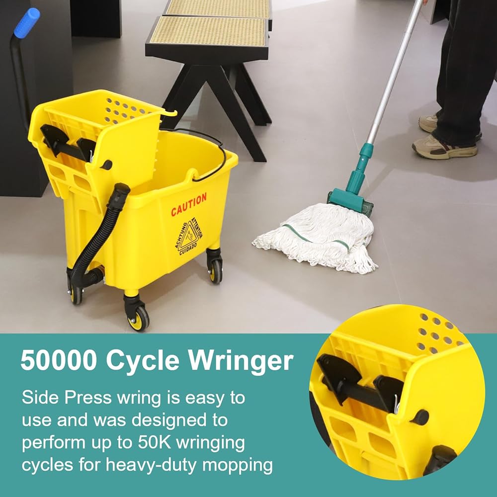 نظام عصارة فعال: يتميز بعصارة ضغط جانبية مُصنفة لـ 50000 دورة - مثالية للتنظيف الشاق. يوفر أداءً ثابتًا بجهد أقل، مما يجعله مثاليًا لموظفي النظافة والمناطق ذات الازدحام الشديد.