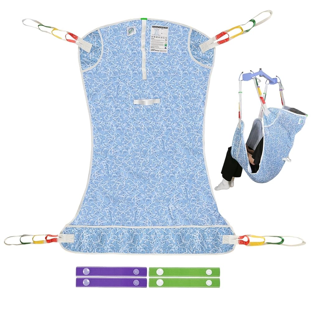The EHUSPU Full Body Patient Lift Sling provides safe, comfortable, and dignified transfers for elderly, disabled, and mobility-impaired users. Designed for caregivers and healthcare professionals, it ensures secure lifting from bed to wheelchair, shower, or toilet with ease and reliability. Made from durable, quick-dry mesh fabric, this sling allows excellent air circulation and stays fresh even after repeated use. The padded leg supports help distribute body weight evenly for a smoother and more supportive lift. Color-coded loop straps make it simple to adjust the length and positioning for 2- or 4-point lift systems, ensuring comfort and stability during each transfer. Positioning handles allow caregivers to make safe and easy adjustments (not for lifting). The sling is tested for 500 lbs dynamic load and 750 lbs static load, remaining strong and dependable even after multiple wash cycles. Unlike ordinary patient slings, EHUSPU's full body design features vibrant patterns that bring warmth and positivity to everyday care — helping loved ones feel relaxed and confident during transfers. Perfect for home care, hospitals, or rehabilitation settings, this sling combines safety, comfort, and durability in every lift.