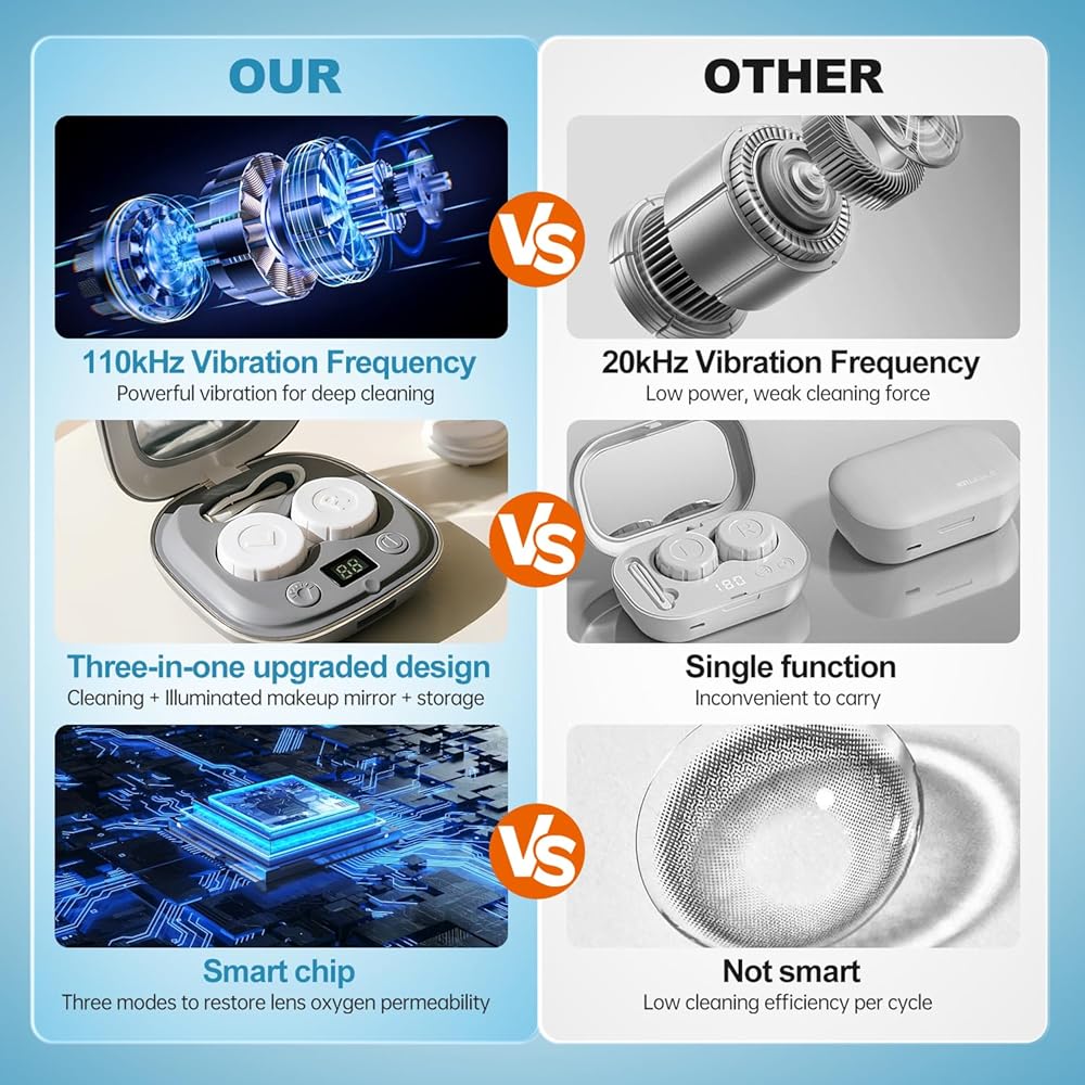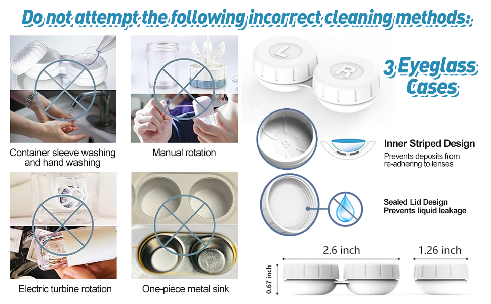 • تنظيف شامل بزاوية 360 درجة: يعمل التشغيل بزر واحد على استعادة اللمسة النهائية المرآة لعلبة العدسة، مما يزيد السطوع بنسبة 99%. تأتي مع 3 حافظات عدسات قابلة للاستبدال لتخزين العدسات وفصلها بسهولة، وسهولة الحمل. نصائح ودية: 1. استخدام محلول العدسات اللاصقة سيؤدي إلى نتائج تنظيف أفضل؛ تجنب استخدام الماء. 2. يرجى الشحن قبل الاستخدام الأول للتأكد من أن الجهاز يعمل بشكل صحيح
