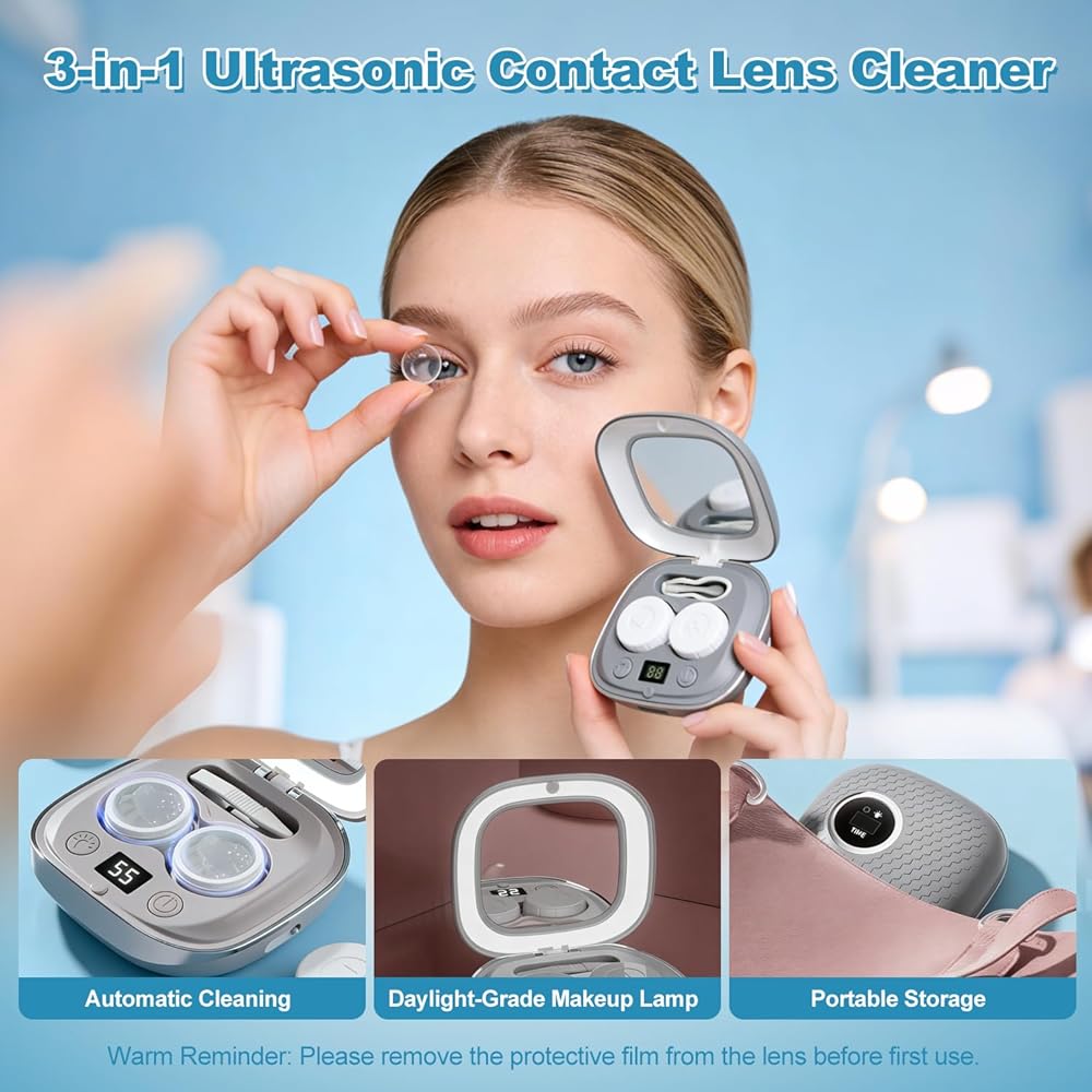 • [تصميم متعدد الوظائف 3 في 1] يجمع هذا التصميم 3 في 1 بين التنظيف ومرآة المكياج المضيئة والتخزين المحمول. تحافظ وظيفة التنظيف التلقائي على العدسات في حالة مثالية. تساعد مرآة المكياج المزودة بإضاءة نهارية (قم بإزالة الطبقة الواقية قبل الاستخدام الأول) في وضع العدسات ووضع الماكياج بكفاءة. بعد التنظيف، ضع العدسات ومحلول العدسات اللاصقة في العلبة، ثم ضع العلبة في الجهاز لسهولة الحمل
