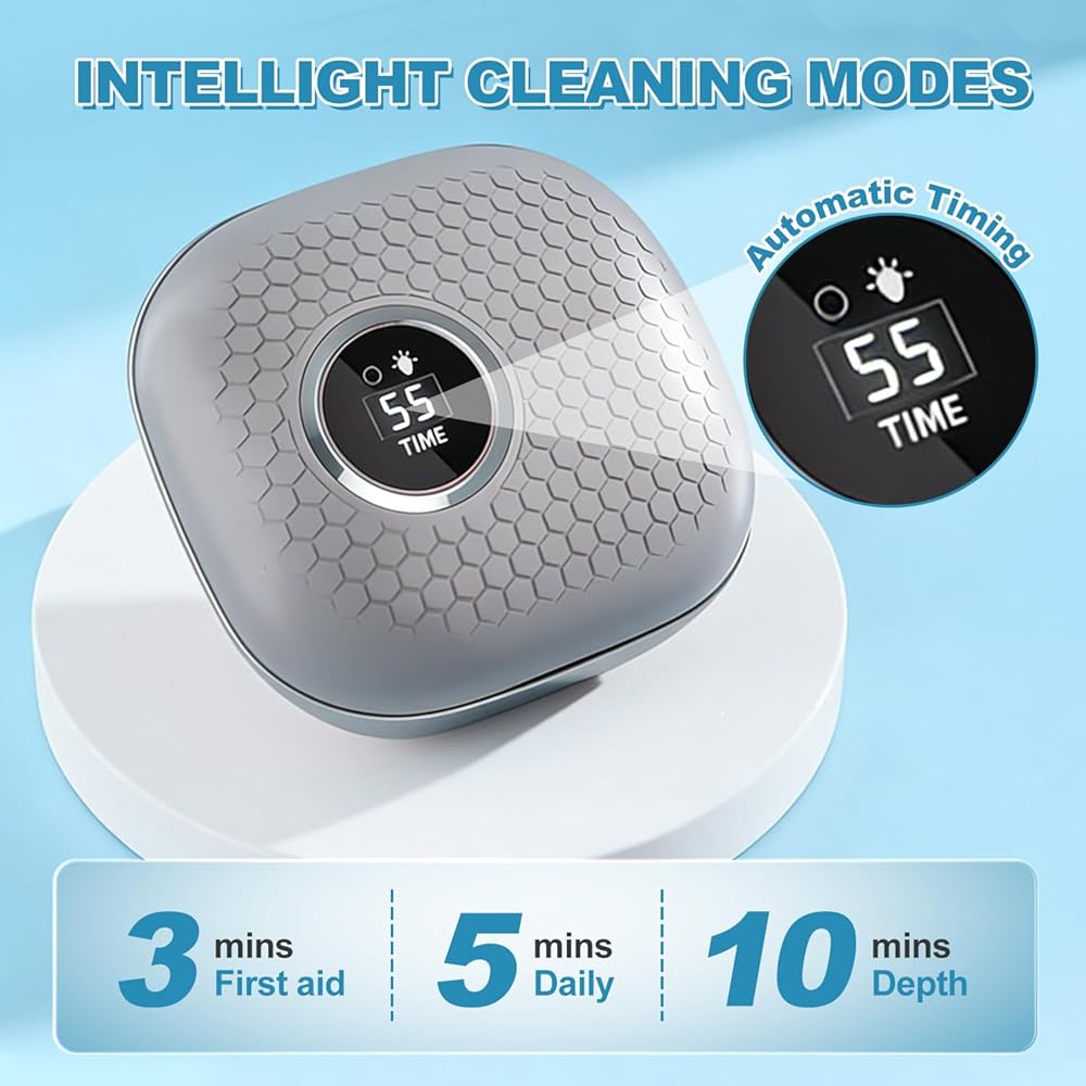 • [3 أوضاع للتنظيف] توفر 3 أوضاع: التنظيف السريع لمدة 3 دقائق، والتنظيف اليومي لمدة 5 دقائق، والتنظيف العميق لمدة 10 دقائق. يبدأ العد التنازلي لمدة 60 ثانية ويستمر حتى اكتمال التنظيف. يستخدم الإصدار الذي تمت ترقيته شحن USB لضمان طاقة البطارية الكافية. عندما تومض الشاشة "88"، تحتاج إلى الشحن. يتوقف تلقائيًا عند الشحن الكامل