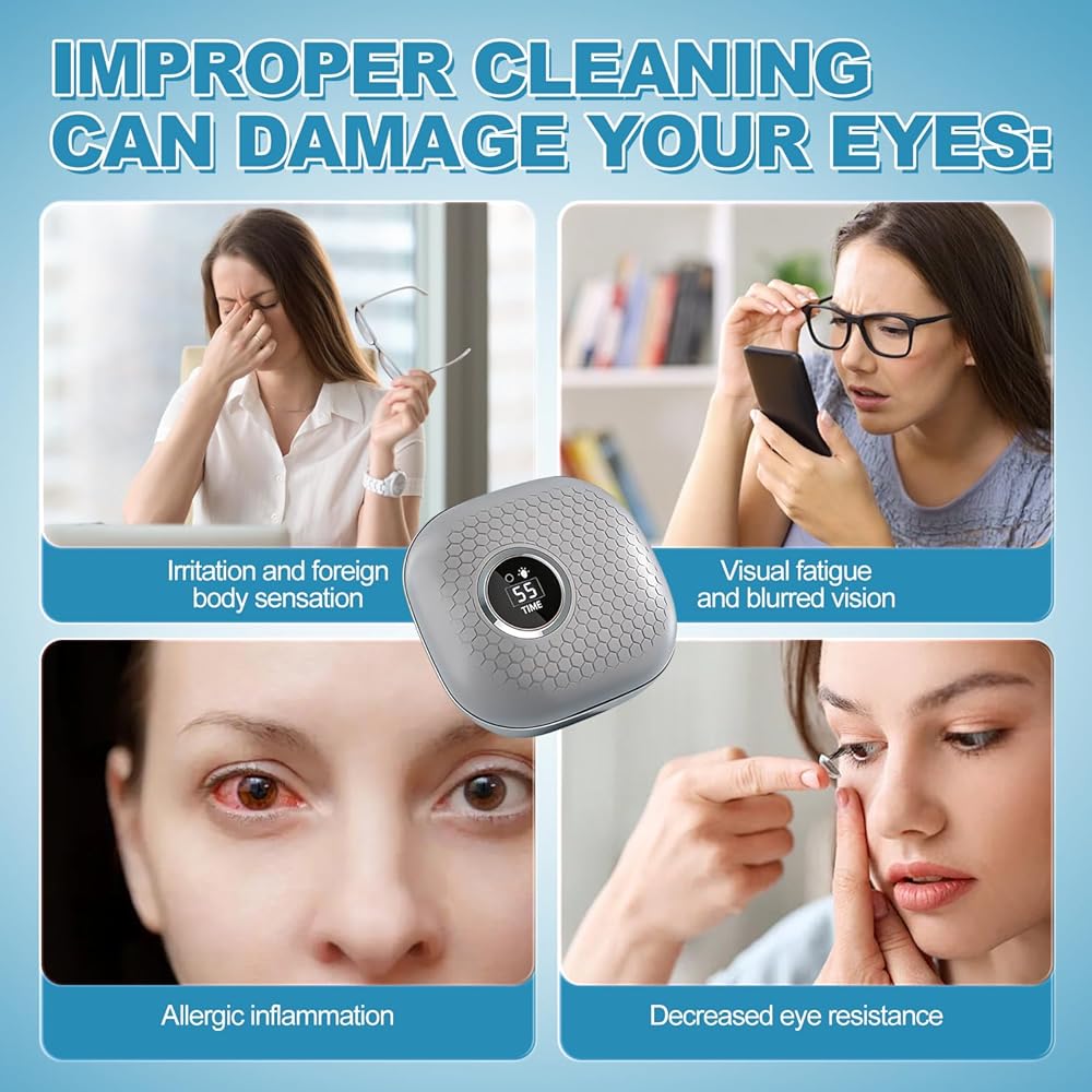 • تنظيف بالموجات فوق الصوتية 110 كيلو هرتز: يستخدم منظف العدسات اللاصقة هذا محركًا عالي التردد 110 كيلو هرتز، أي ضعف قوة المنظفات العادية! تعمل قوة الاختراق القوية على إزالة الشوائب من العدسات بشكل فعال في وقت قصير، وتنظيفها بالكامل دون التسبب في أي ضرر. مناسبة لجميع العدسات اللاصقة. أكثر أمانًا ودقة من غسل اليدين