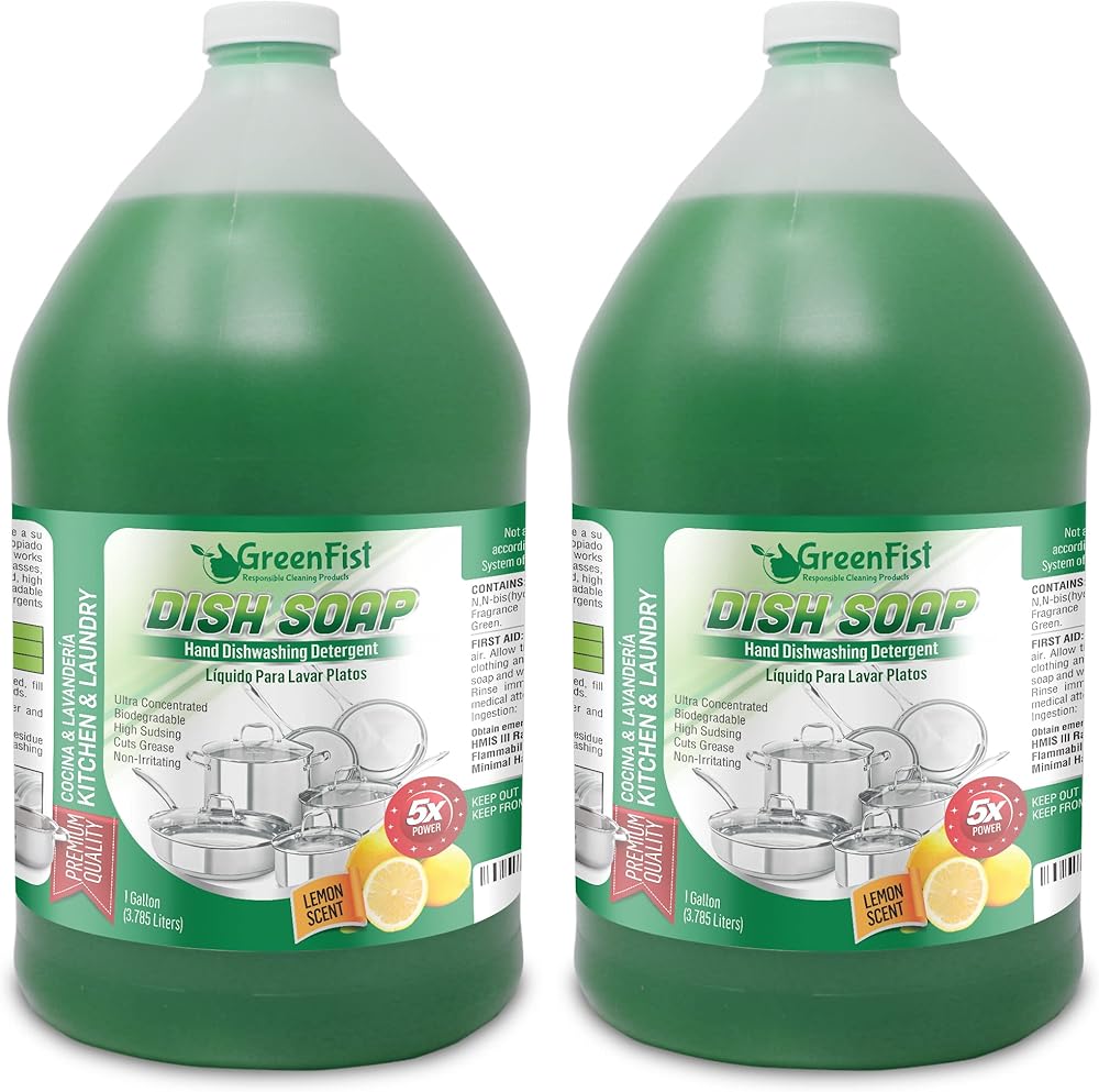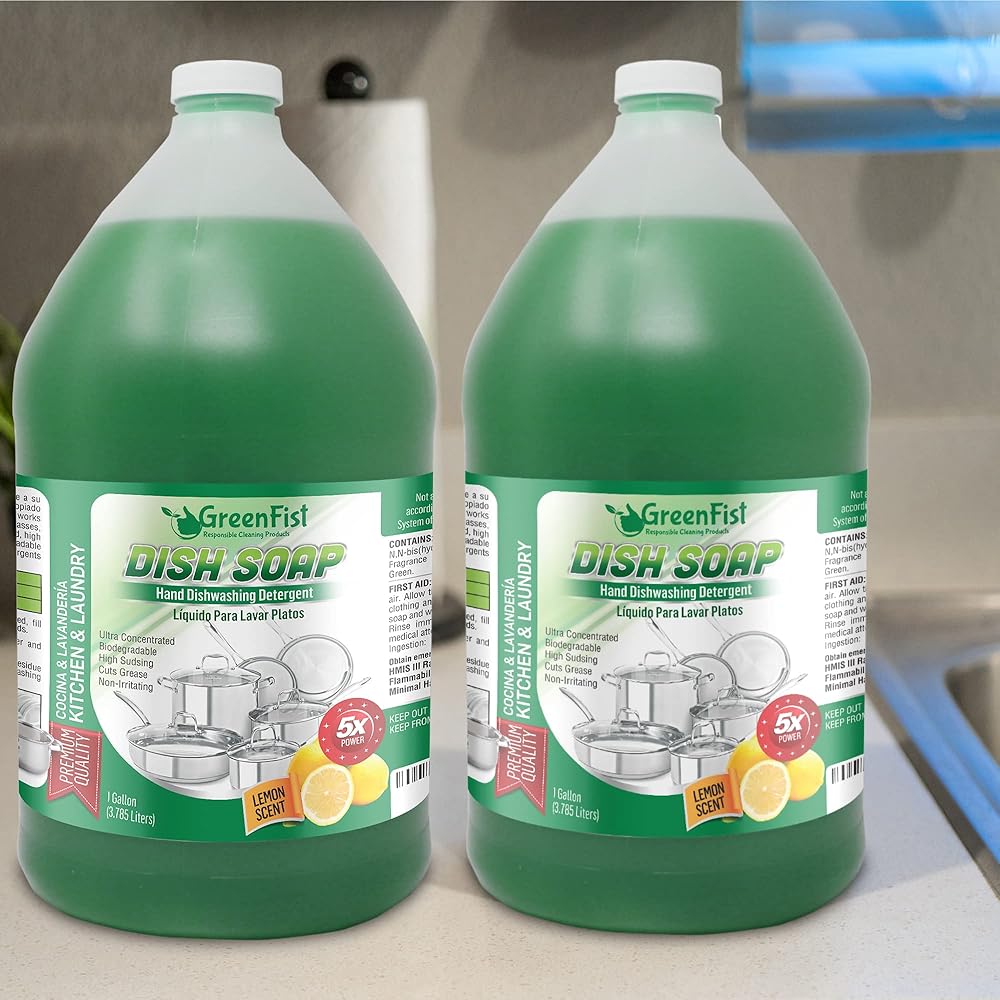 Are you looking for hand washing liquid detergent that cuts the grease and has a light fragrance? A professional grade solution that is fast, powerful, yet leaves the hands soft? Well, Green Hand Dish Detergent is just for you. Made by GreenFist, Green Dish Soap features laboratory-formulated, synthetic, highly concentrated compound which has been created to meet modern standards in cleaning. Dishes, glasses, pots and pans, kitchen appliances, leathers, plastics, mirrors and table tops gleam after cleaning with this liquid detergent. Imagine your hands softer, dishes clean, polished and shiny, and that is what exactly you'll get using Unisoft. The time for sophisticated, natural and effective hand dish washing is finally here. Fast, Effective & Economical Solution Easy cleaning process: - An economical solution of 1 ounce of this concentrated compound in 8 gallons of water will thoroughly clean glasses, dishes, pots and pans, leaving them sparkling. - Soak heavily encrusted pots and pans in this same dilution for a few minutes for amazingly easy result in cleaning them. Versatile Usage Besides being your reliable and effective hand dish washing solution, the innovative advanced cleaning formula allows for versatile usage. Apply a few drops of this concentrated compound to a damp, clean cloth or sponge. Wipe stove, refrigerators, table tops, leathers and plastics sparkling clean, without rinsing. Non-toxic & Biodegradable Our hand dish soap and its packaging are made of ingredients that are, biodegradable and not tested on animals.