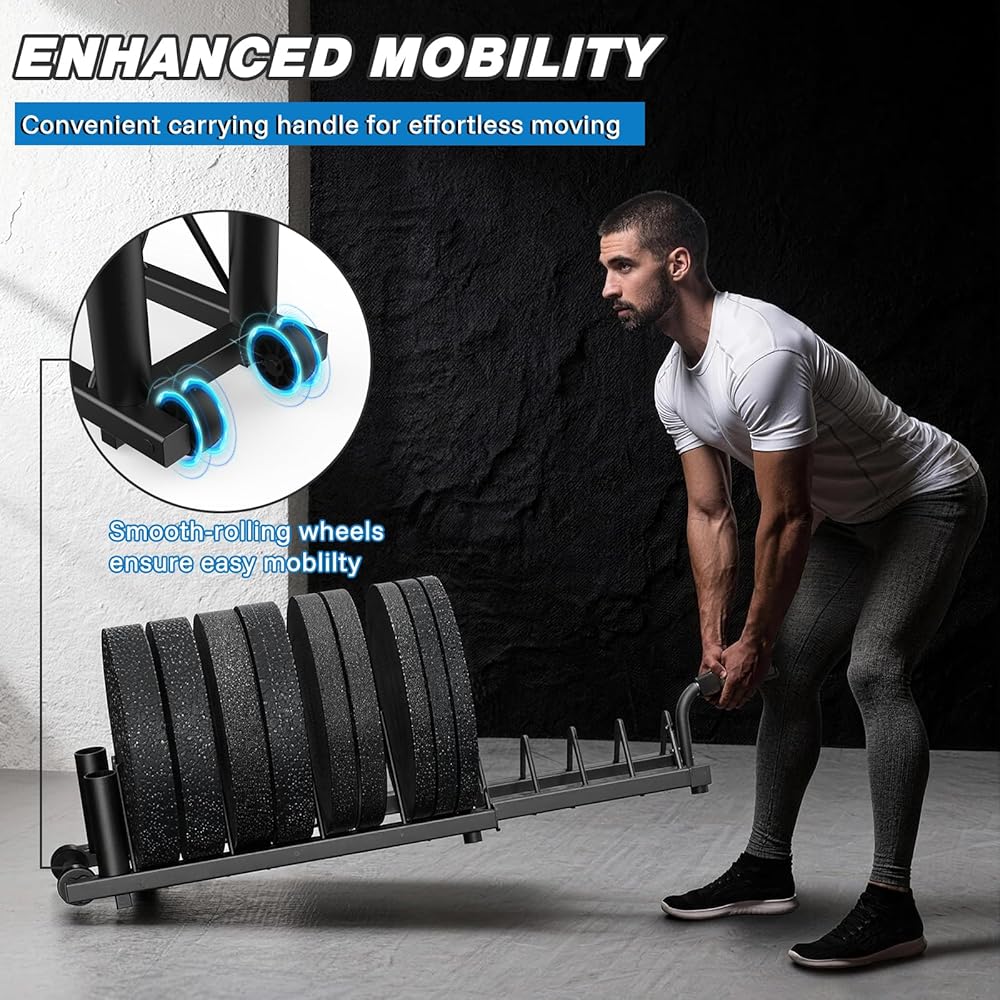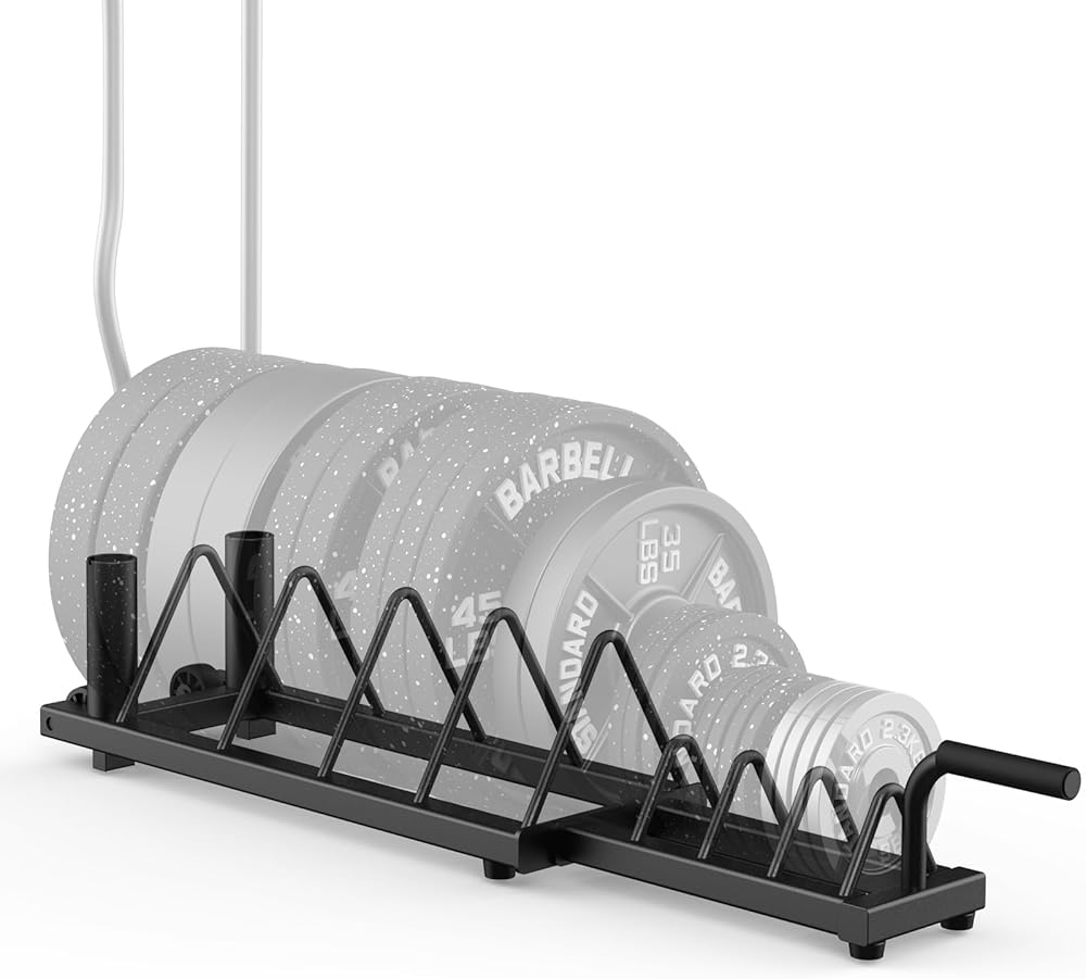 رف لوحات الوزن الأفقي من بيكينج، حامل الوزن لألواح الوزن والقضبان الأولمبية، حامل لوحة ممتص الصدمات مع مقبض وعجلات دوارة، منظم صالة الألعاب الرياضية المحمول مع قسم وزن كسور للوحات مقاس 1 بوصة و2 بوصة