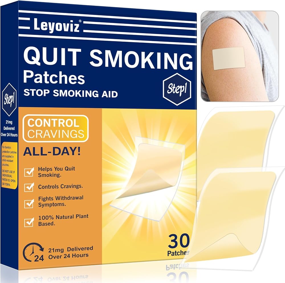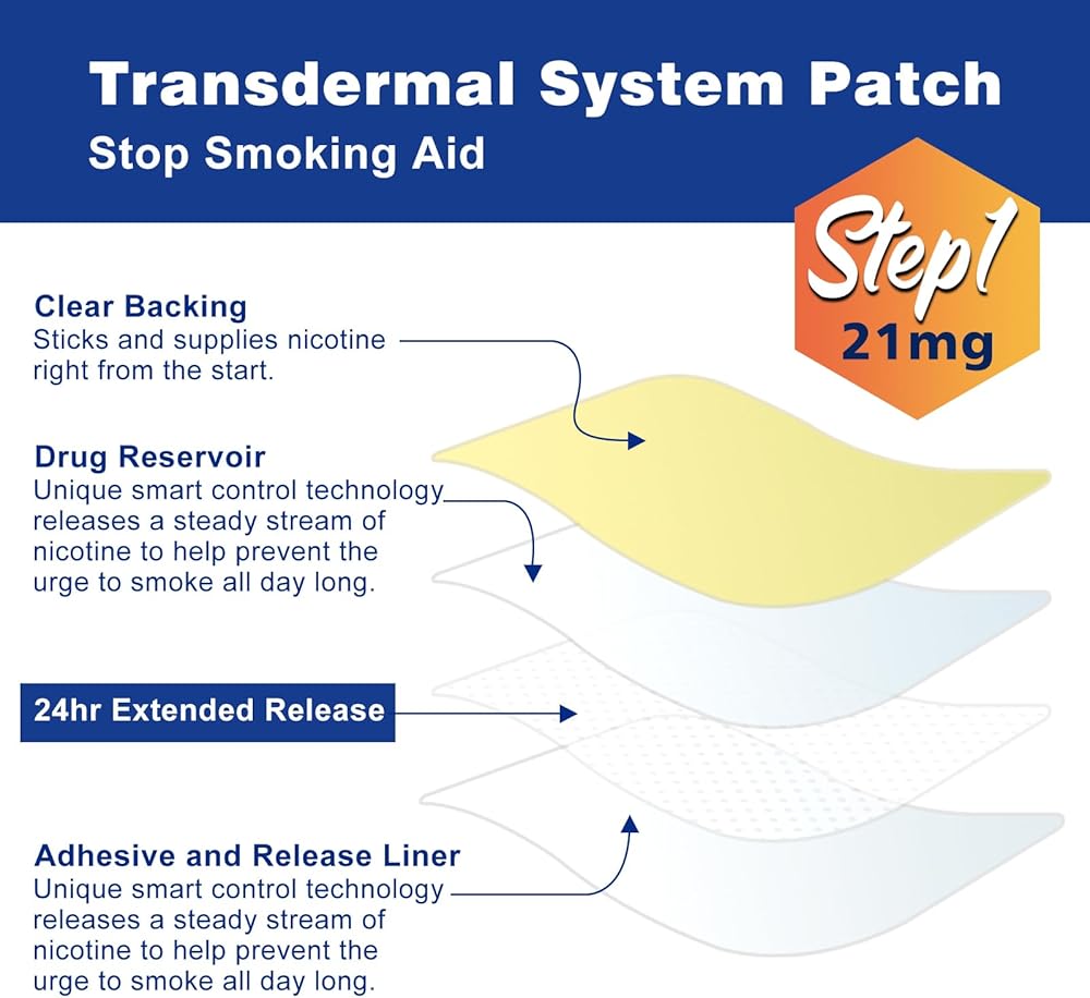 لصقات النيكوتين للإقلاع عن التدخين، الخطوة 1، 21 مجم من رقعة الإقلاع عن التدخين، 30 قطعة من ملصقات الإقلاع عن التدخين التي تعمل لمدة أسبوعين، توفر الرقعة نظام النيكوتين عبر الجلد لمدة 24 ساعة