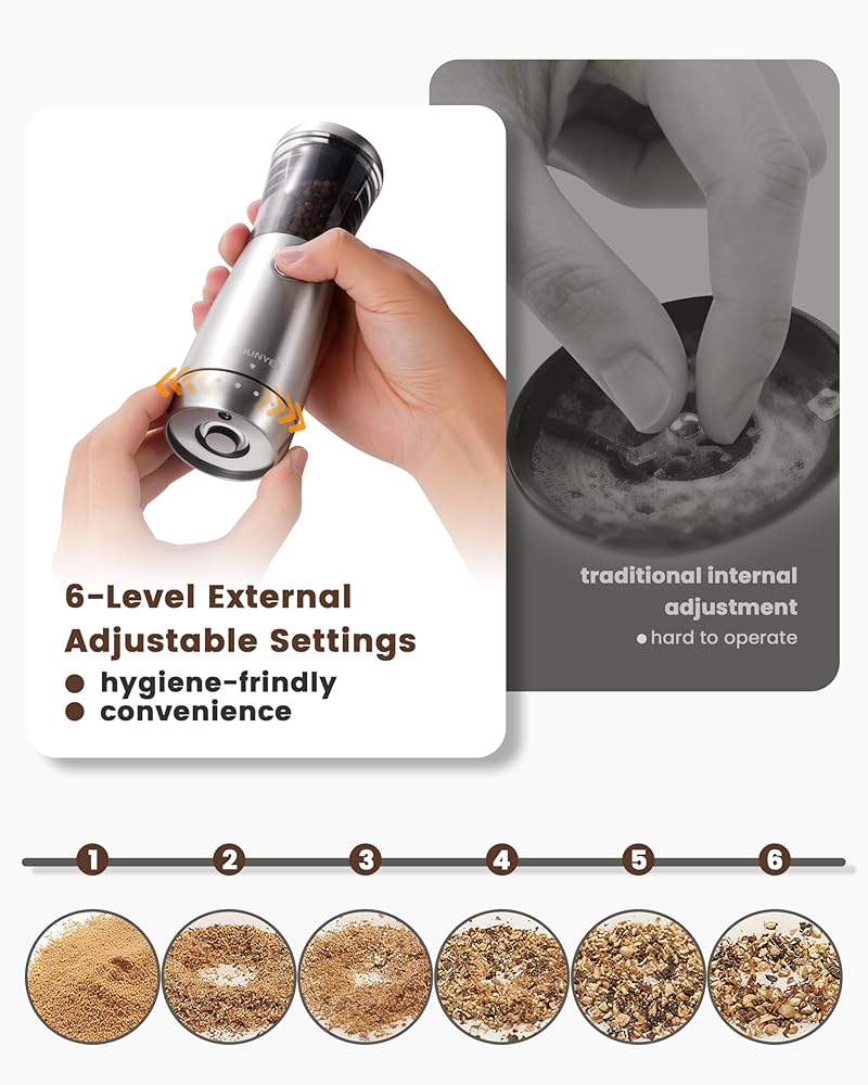 [ضبط الخشونة على 6 مستويات] قم بتخصيص ملمس التوابل من الناعم إلى الخشن عن طريق لف حلقة التعديل بلطف. مثالية لكل شيء بدءًا من الصلصات الرقيقة وحتى تدليك الشواء الجريء، مما يلبي جميع احتياجات الطبخ الخاصة بك بدقة
