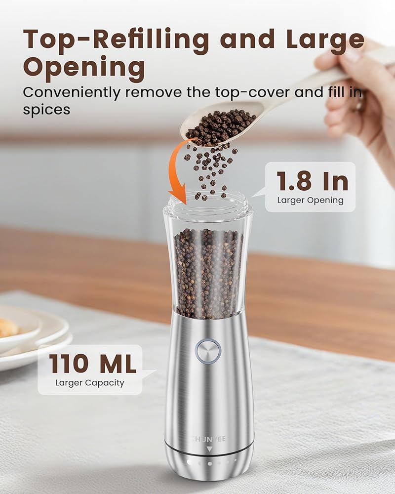 [سعة XL وتصميم إعادة التعبئة العلوية] بسعة كبيرة تبلغ 110 مل، تحتوي على 40% فلفل أكثر. ببساطة قم بلف الغطاء العلوي لإعادة ملء التوابل بسهولة، ثم اضغط على الزر لطحن سهل بلمسة واحدة - مثالي للمستخدمين الذين يعانون من عدم الراحة في المعصم أو كبار السن، مما يضمن توابل مريحة للجميع.
