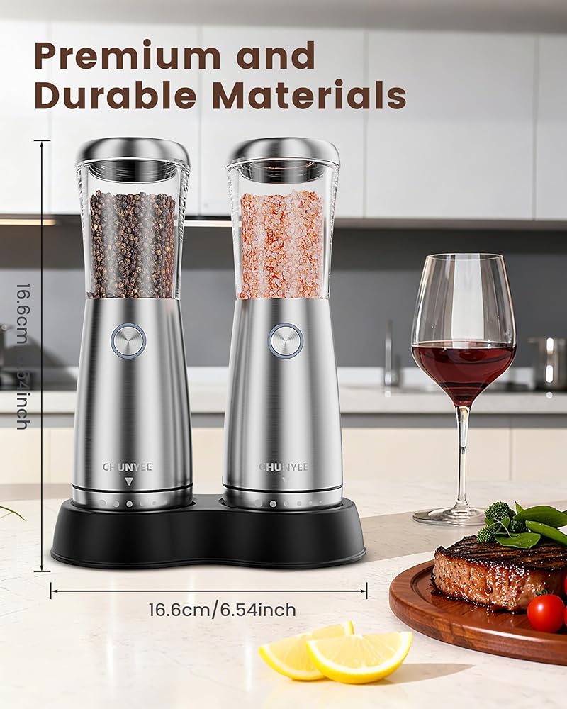 [مظهر ممتاز وآمن للطعام ومظهر عصري] مصنوعة من الفولاذ المقاوم للصدأ 304 عالي الجودة مع خصر أنيق ومحيط، مجموعة مطحنة الملح والفلفل هذه تكمل بسلاسة أنماط ديكور المطبخ وتناول الطعام المتنوعة. كما أن تصميمها الجمالي والمتين العصري يجعلها هدية مثالية لأعياد الميلاد أو الكريسماس أو العطلات أو الانتقال لمنزل جديد أو المناسبات الخاصة