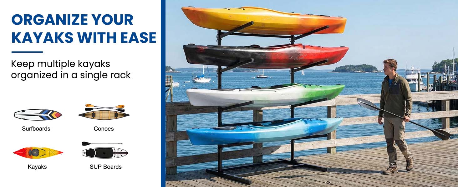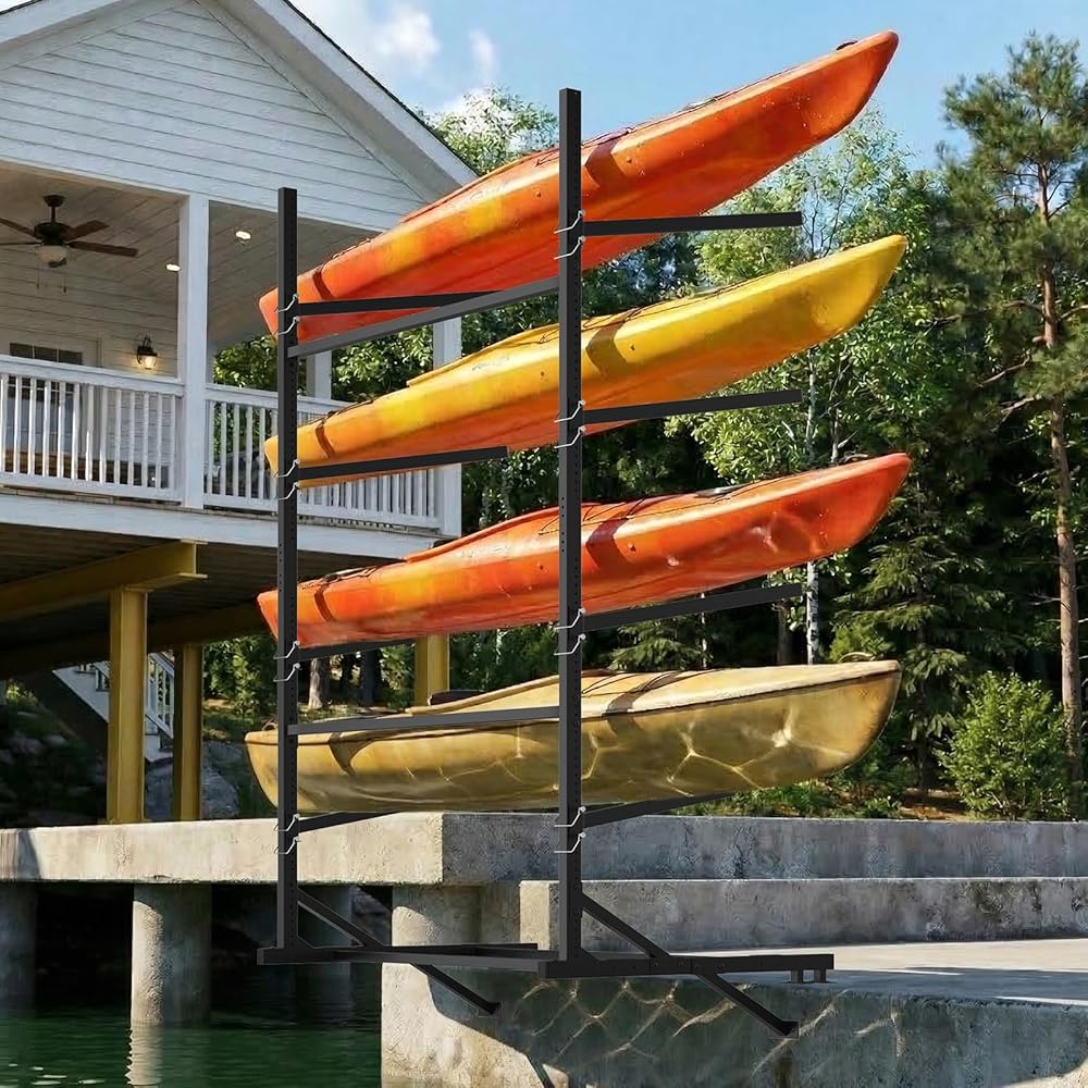 【تصميم قائم بذاته】يعمل التصميم الرأسي متعدد الطبقات على زيادة المساحة مع إبقاء القوارب بعيدًا عن الأرض. مثالية كرف تخزين الكاياك للاستخدام الداخلي أو الخارجي