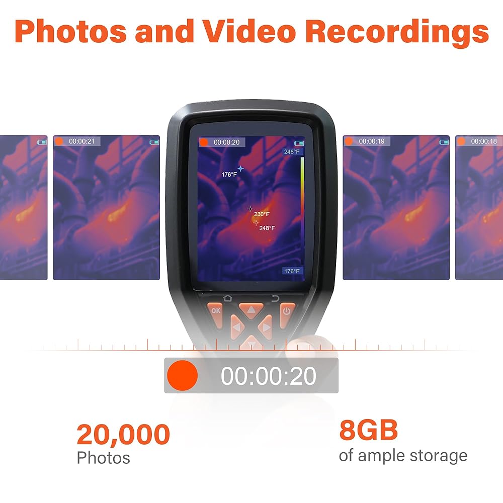 وحدة تخزين مدمجة بسعة 8 جيجابايت لالتقاط صور واسعة النطاق: يمكنك التقاط وتخزين أكثر من 20000 صورة وفيديو حراري بسهولة، مما يضمن الحفاظ على كل تفاصيل الفحص بالكامل. تضمن مساحة التخزين المدمجة بسعة 8 جيجا بايت أمان البيانات وتسمح لك بالوصول إلى ملفاتك بسهولة أينما كنت. سواء أكان الأمر يتعلق بعمليات فحص المنزل، أو فحص اللوحات الكهربائية ونظام التدفئة والتهوية وتكييف الهواء (HVAC)، أو تشخيص الآلات، فإن جهاز التصوير الحراري هذا يساعدك في الاحتفاظ بسجل منظم جيدًا للمراجعة والتحليل الفعال.