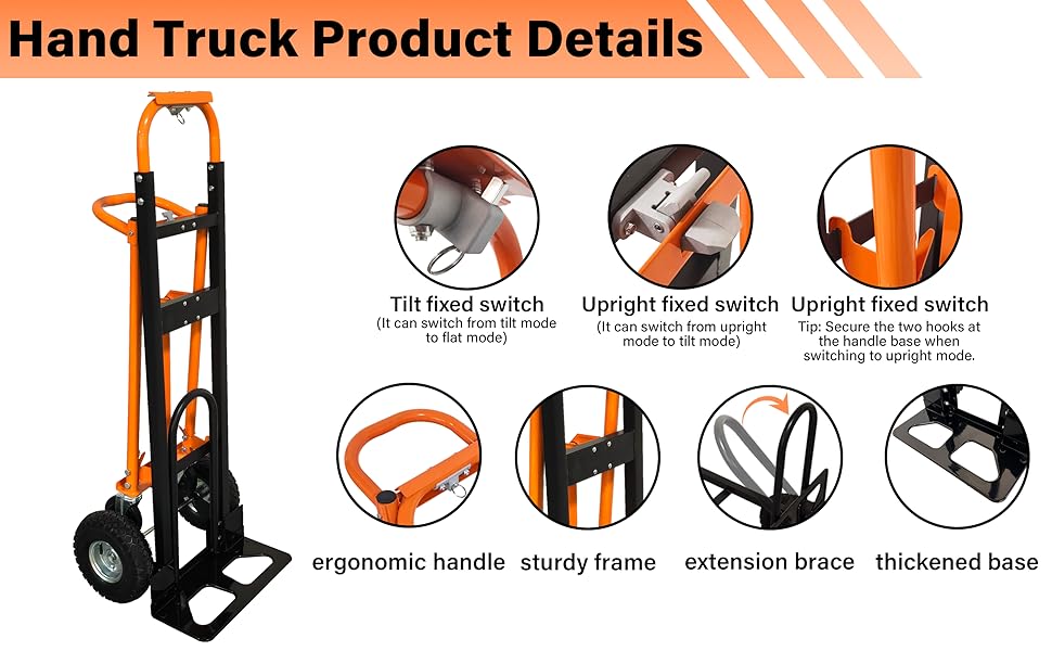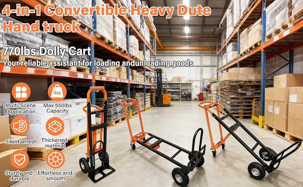 سعة تحميل ثقيلة: مصنوع بإطار معدني عالي القوة، وهو متين ويوفر أداءً طويل الأمد. يمكنها حمل ما يصل إلى 770 رطلاً في الوضع المسطح، و600 رطل في وضع الإمالة، و500 رطل في الوضع الرأسي، مما يجعلها مثالية لنقل الثلاجات والأثاث والخشب وغيرها من العناصر الصناعية الكبيرة.