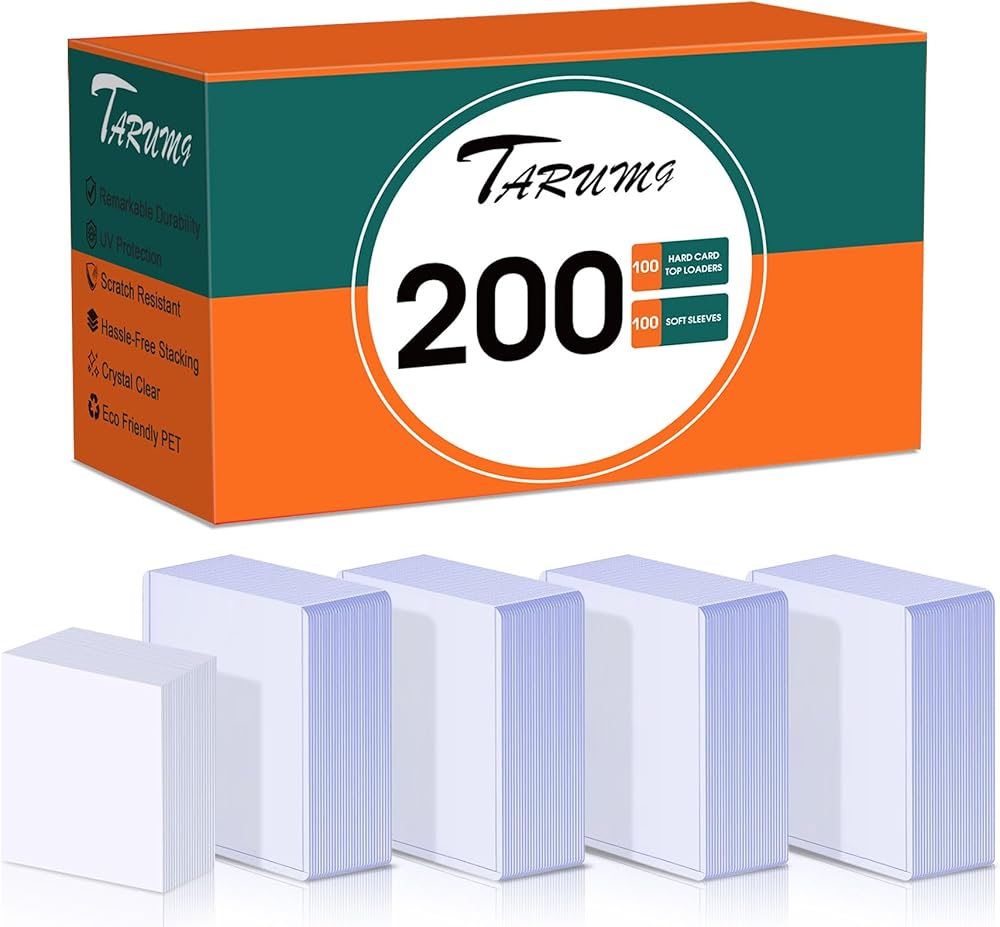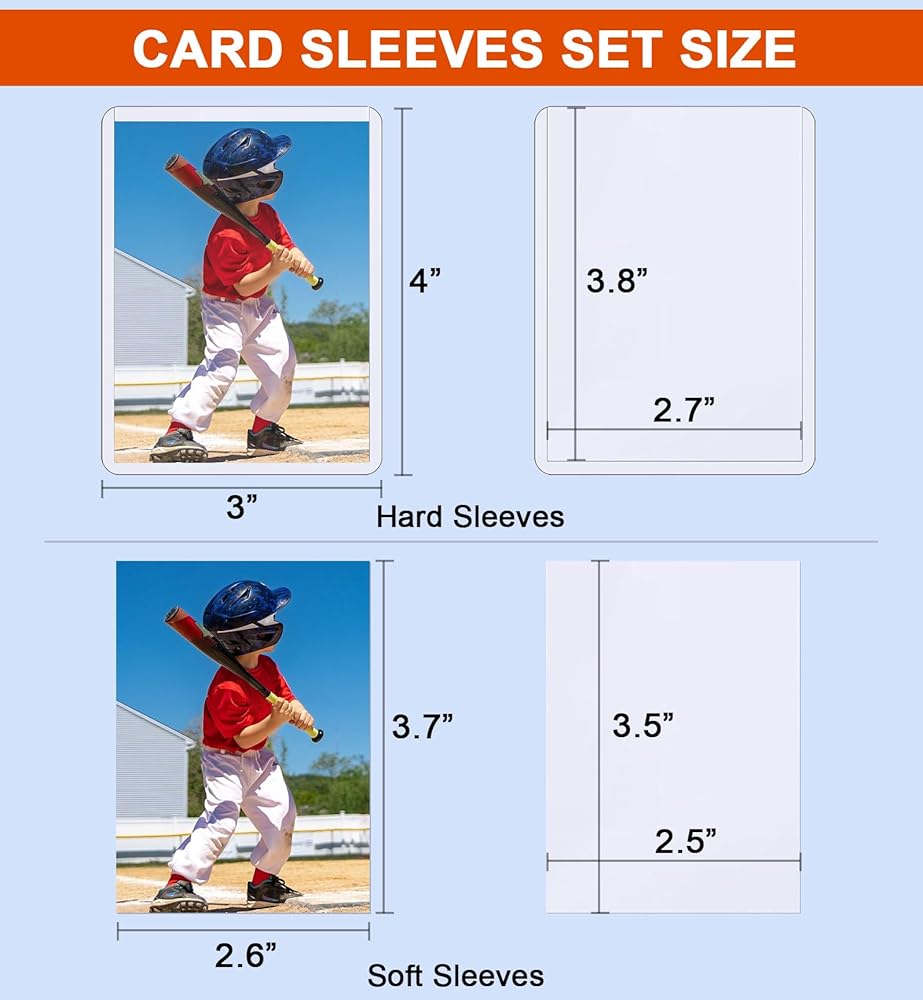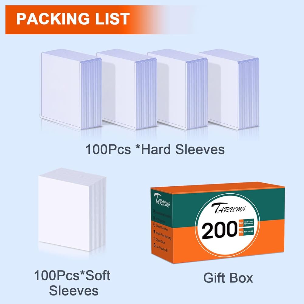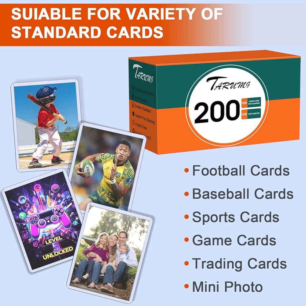 200 حافظة بطاقات ذات تحميل علوي للبطاقات، 3 × 4 بوصة، واقيات بطاقات البيسبول الممتازة ذات الحجم القياسي، لتجارة بطاقات ألعاب كرة القدم البيسبول الرياضية (100 أكمام صلبة + 100 أكمام ناعمة)