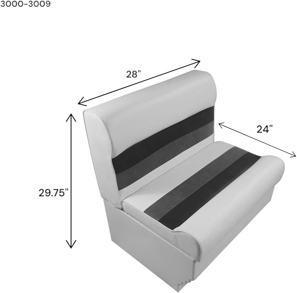 28" Premium Series Pontoon Bench Seat Cushion Set with base. Hinge lift-up set cushion design for storage access when attached to Premium Series Base. Contoured cushions with high compression foam padding. 28oz marine grade vinyl withstands the effects of the sun, heat, rain and staining under normal marine enviornment conditions. Perfect color and style match with Horizon Manufacturing Premium Series Pontoon Components Seat Cushion Dimensions: Width-28", Depth-24", Seat Depth-17.25", Seat Height-18"; Back Height with Base-29.75"