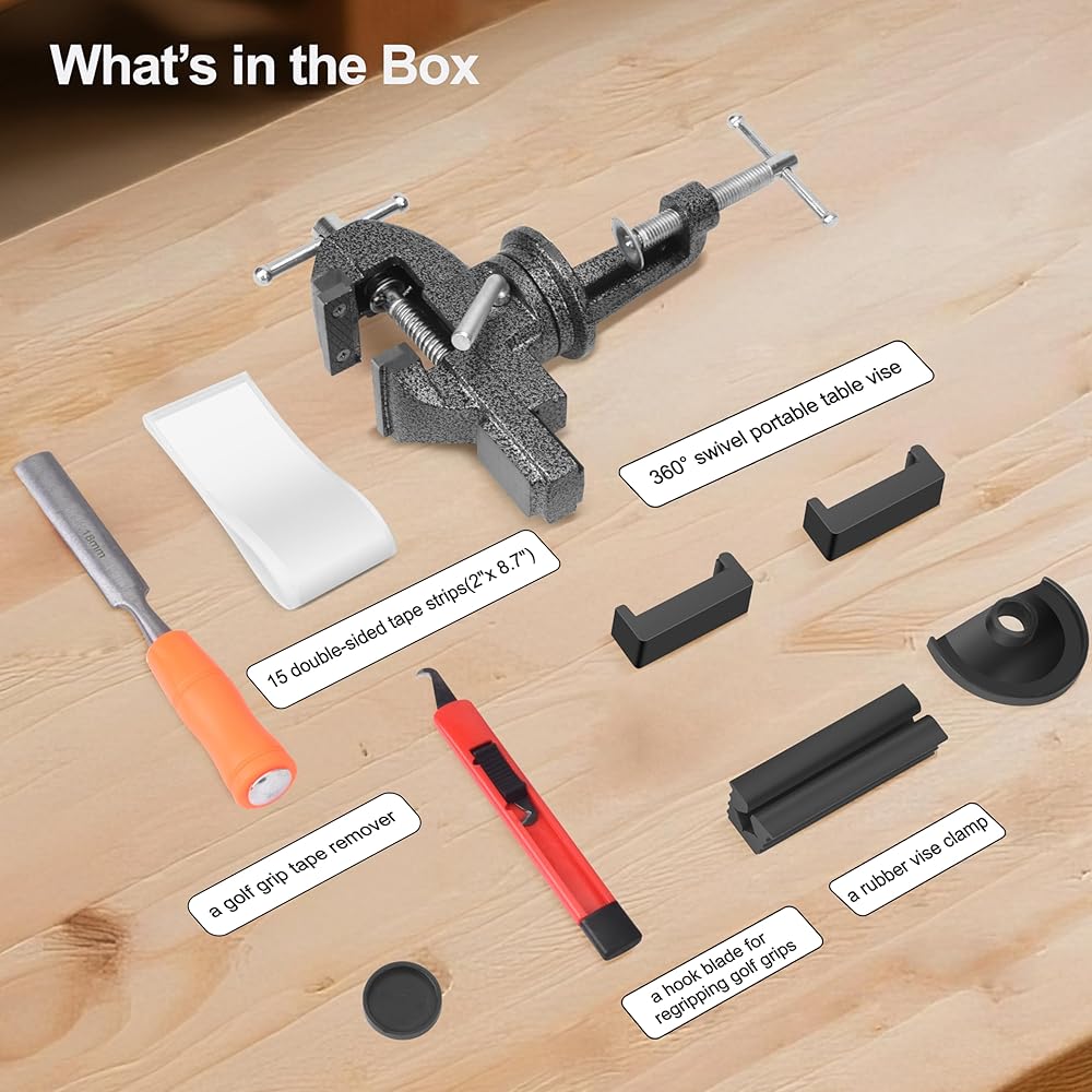 - مجموعة أدوات الجولف الكل في واحد - تتضمن كل ما تحتاجه لإزالة وتثبيت مقابض الجولف: مشبك ملزمة، ومشبك عمود مطاطي، وشفرة خطاف لإعادة قبضة مقابض الجولف، ومزيل شريط قبضة الجولف، و15 شريطًا لاصقًا