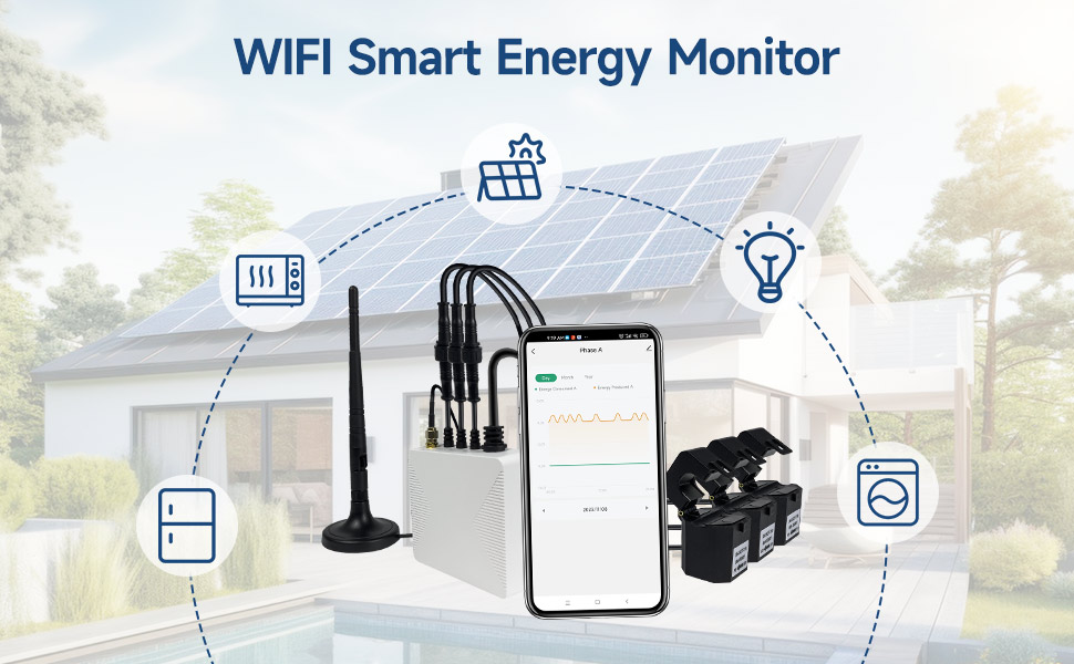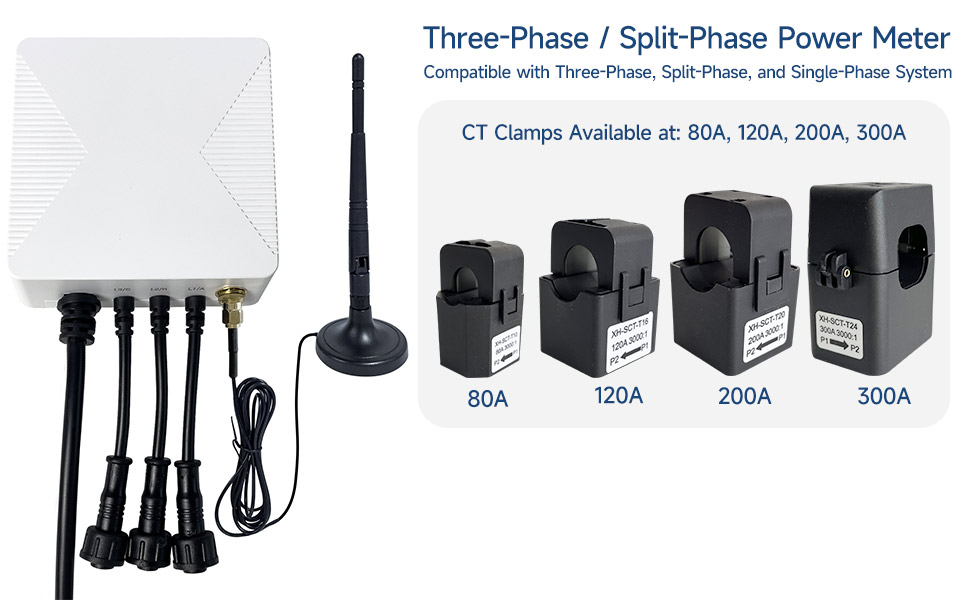 • البيانات في الوقت الفعلي: تتطلب شبكة WiFi بتردد 2.4 جيجا هرتز مع إمكانية الوصول إلى الإنترنت لمراقبة تطبيقات الهاتف. مع 3*120A أجهزة استشعار CT للمحول الحالي بدقة ± 2%. يدعم بيانات القياس ثنائية الاتجاه. إذا تم تثبيت أجهزة الاستشعار المشبكية عكس الاتجاه الحالي، فستعرض البيانات قيمة سلبية