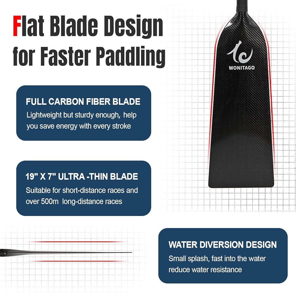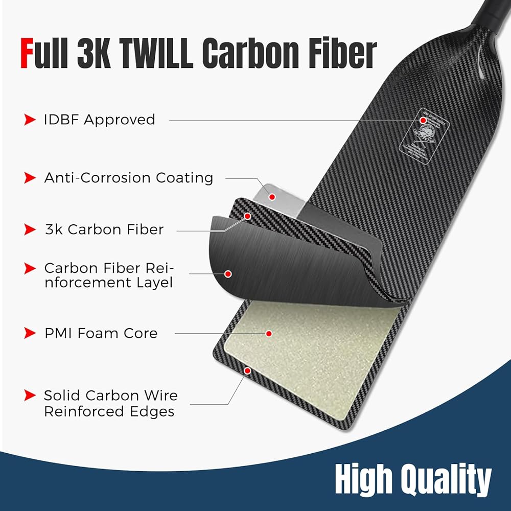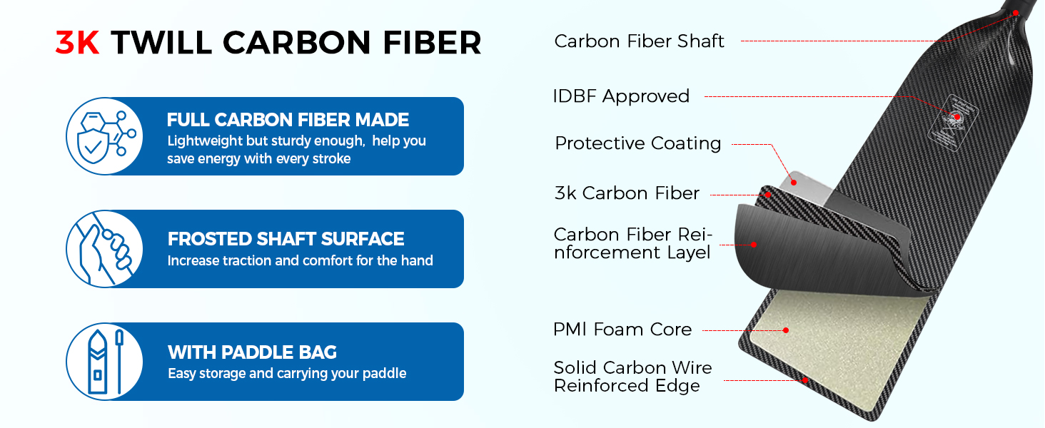مجداف قارب التنين من ألياف الكربون بالكامل --- مصنوع من عمود وشفرة ألياف الكربون 3K الممتازة، خفيف الوزن ولكنه قوي بما فيه الكفاية (1.0 رطل فقط)، يجعل التجديف فعالاً وسلسًا وسريعًا