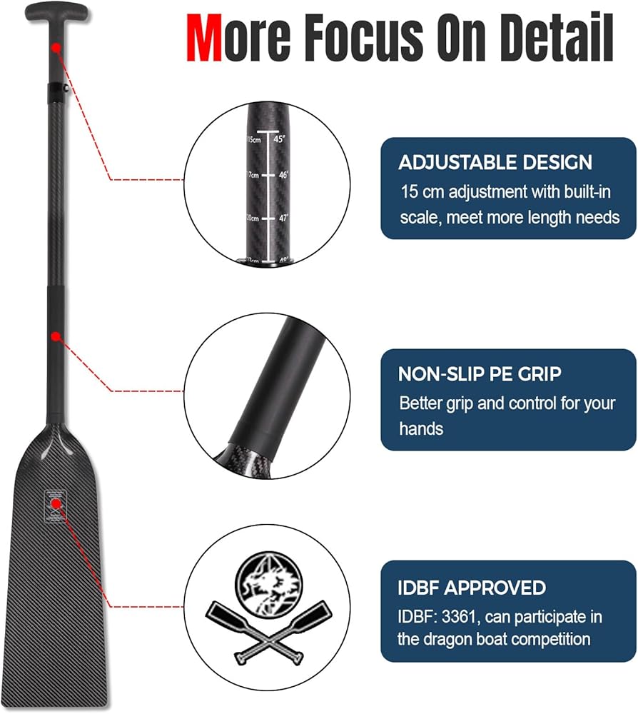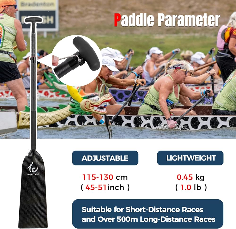 مجداف قارب التنين قابلة للتعديل --- تعديل 15 سم لتلبية المزيد من احتياجات الطول، الطول الإجمالي 45 بوصة - 51 بوصة (115-130 سم)، مناسبة لمعظم تجديف قوارب التنين بما في ذلك النساء.