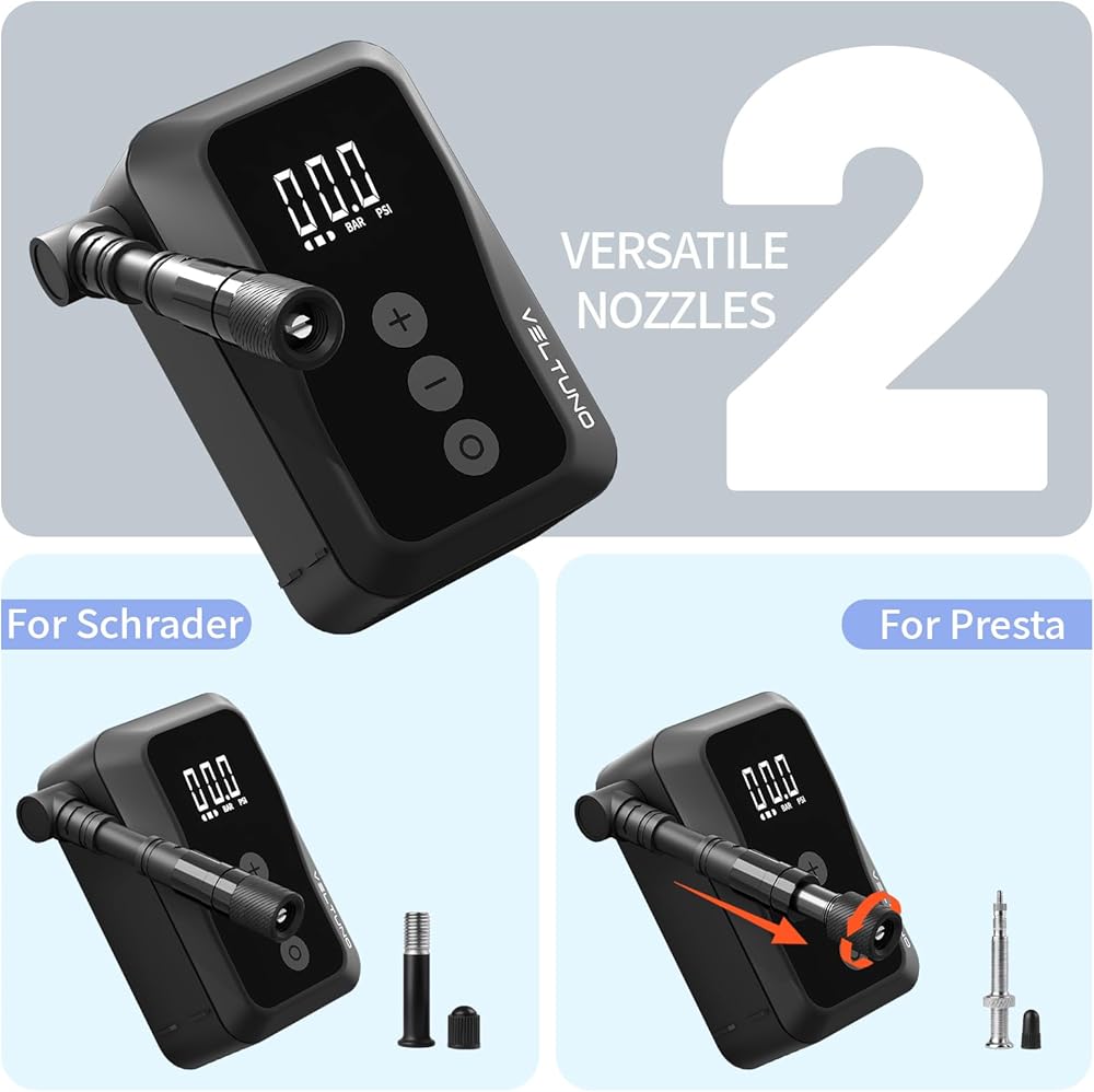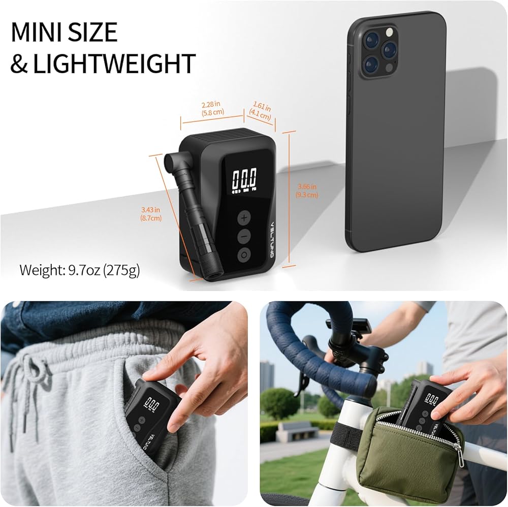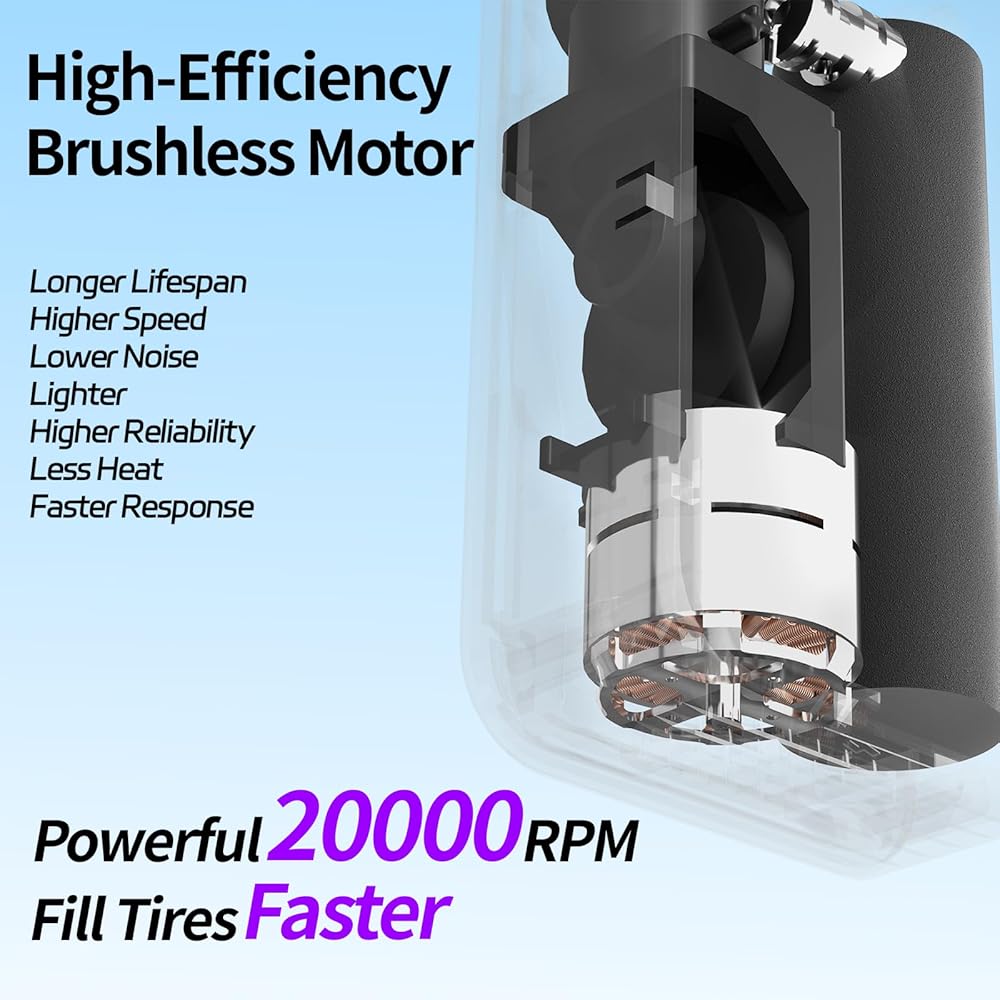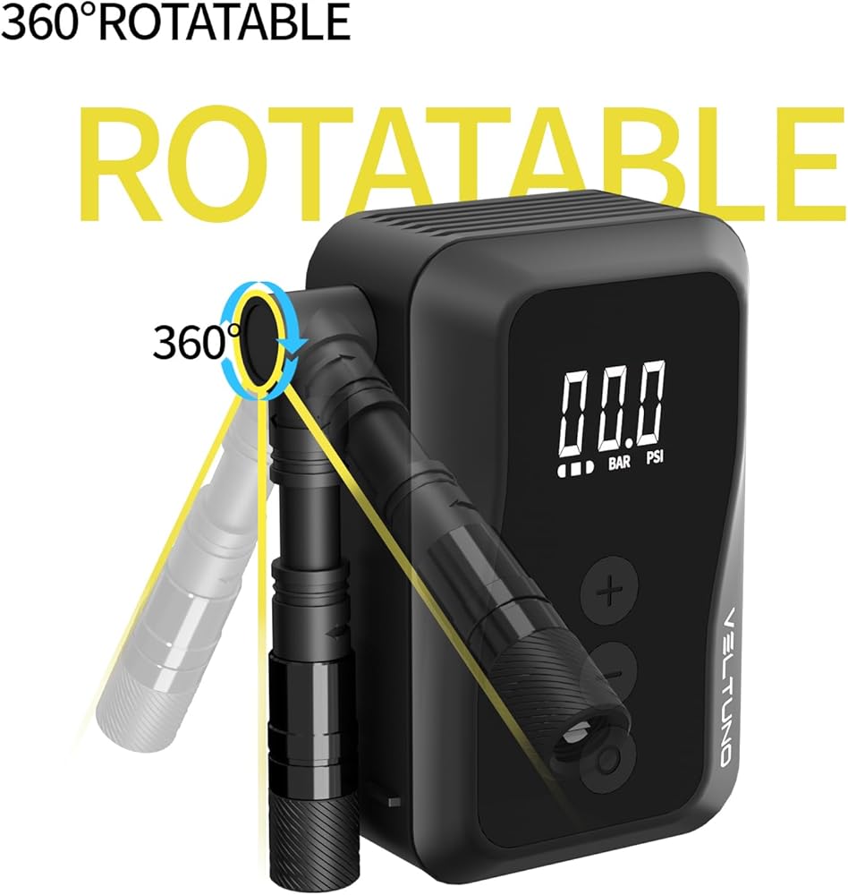نفخ سريع 150 رطل لكل بوصة مربعة ومحرك هادئ: استمتع بالطاقة الفعالة مع مضخة الهواء الكهربائية الخاصة بنا، والتي تتميز بمحرك بدون فرش يوفر ما يصل إلى 150 رطل لكل بوصة مربعة. باعتبارها مضخة دراجة محمولة عالية الأداء، فإنها تنفخ إطار الطريق 700x23c في أقل من 30 ثانية (80-100 رطل لكل بوصة مربعة). تم تصميم مضخة الدراجة هذه للسرعة وطول العمر، وتعمل بسرعة 20000 دورة في الدقيقة مع حرارة منخفضة وأقل ضوضاء، مما يجعلها مضخة الدراجة المثالية للإصلاحات السريعة على جانب الطريق.