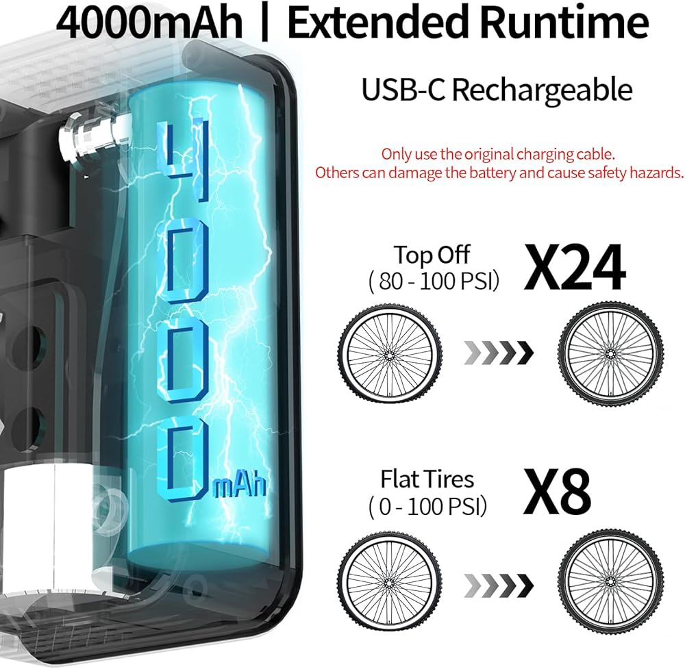 4000 مللي أمبير قابلة لإعادة الشحن وبحجم الجيب: تعتبر مضخة الدراجة الكهربائية الصغيرة هذه ضرورية للسفر، وتزن 9.7 أونصة فقط وأصغر من الهاتف. تعمل مضخة الدراجة القابلة لإعادة الشحن هذه ببطارية قوية تبلغ 4000 مللي أمبير في الساعة، ويمكنها نفخ ما يصل إلى 24 إطارًا لكل شحنة. تصميمها خفيف الوزن يجعلها مضخة إطارات محمولة مثالية يمكن وضعها بسهولة في جيوب الجيرسي أو حقائب السرج، مما يوفر نفخًا موثوقًا يعمل بالبطارية للتنقلات اليومية أو الرحلات الطويلة