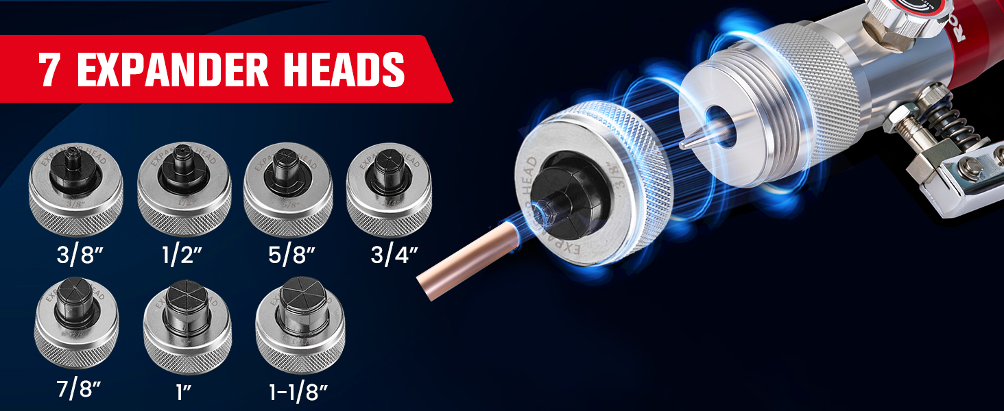 [قوالب توسيع متعددة الاستخدامات 7 في 1] تتضمن مجموعة أدوات التدفئة والتهوية وتكييف الهواء (HVAC) هذه 7 رؤوس: 3/8 بوصة، 1/2 بوصة، 5/8 بوصة، 3/4 بوصة، 7/8 بوصة، 1 بوصة، و1-1/8 بوصة. متعددة الاستخدامات لأقطار الأنابيب المختلفة، إنها أداة الأنابيب المثالية لأنظمة التبريد السكنية أو أنظمة التبريد الصناعية