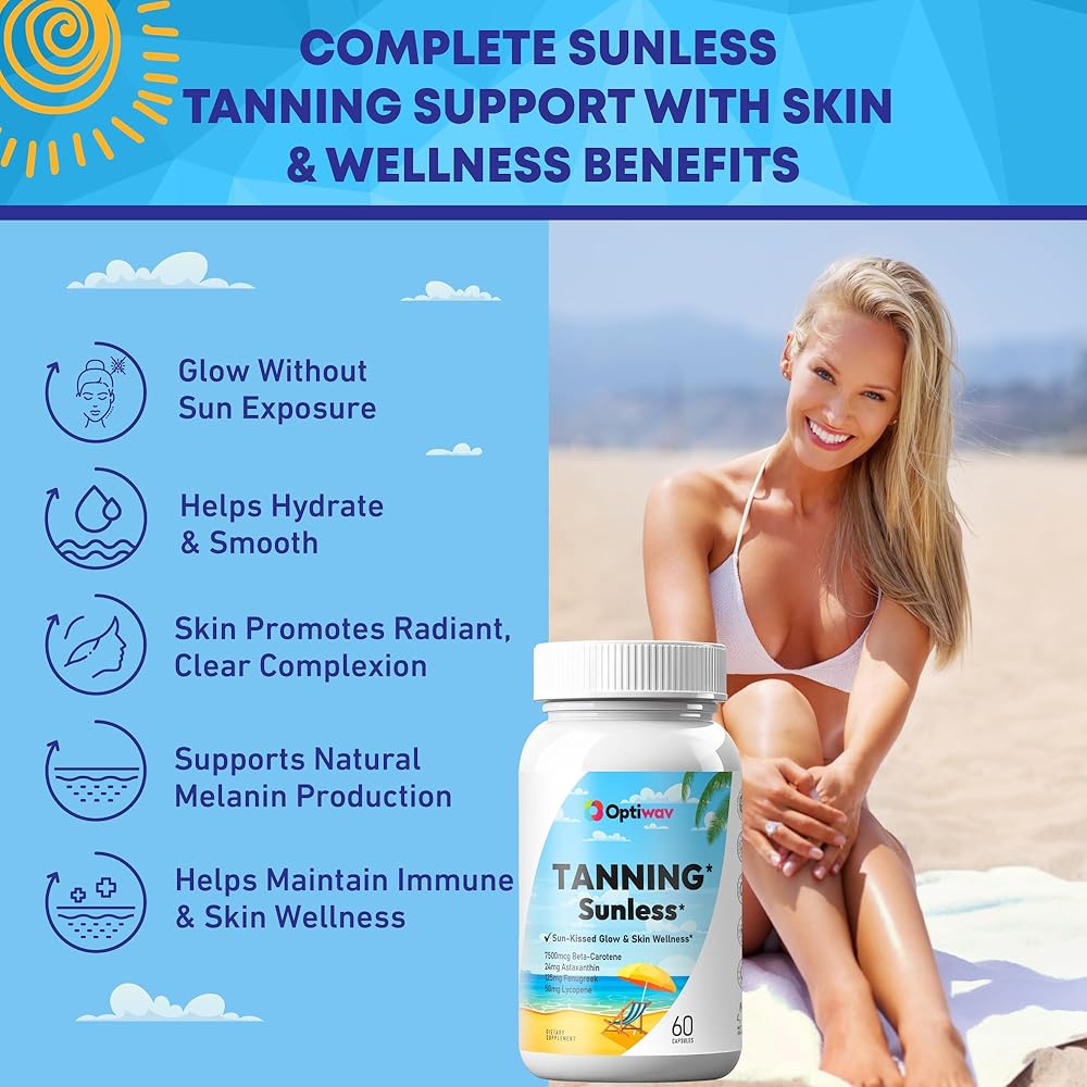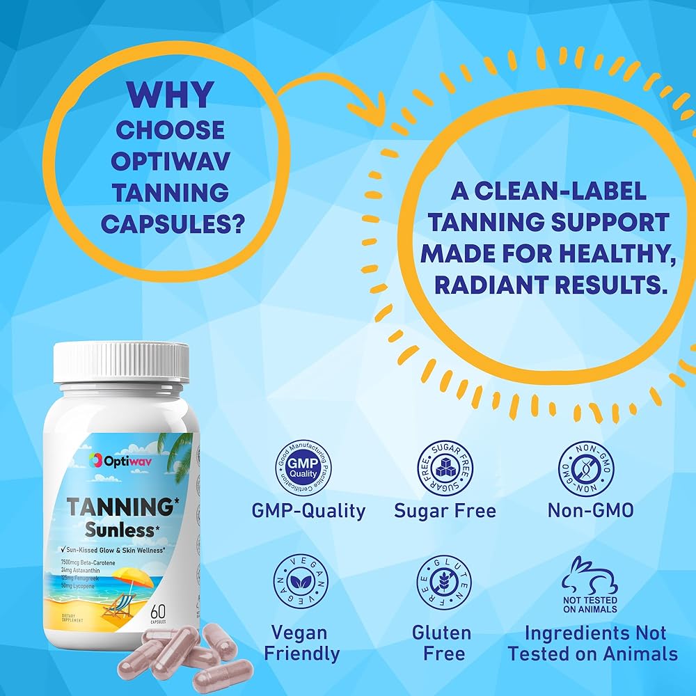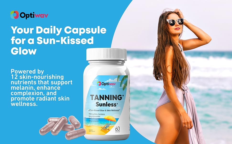 تركيبة متقدمة 12 في 1 لدعم البشرة المتألقة: Optiwav Tanning هو مكمل فموي مصمم للنساء اللاتي يرغبن في التوهج من الداخل إلى الخارج. تشتمل تركيبة التسمير الذاتي هذه على 12 عنصرًا غذائيًا نشطًا مثل أستازانتين والليكوبين والحلبة وبيتا كاروتين. إنه يدعم الميلانين، ويعزز لون البشرة، ويساعد على تحقيق تسمير برونزي سريع حتى بدون التعرض للأشعة فوق البنفسجية أو الشمس، مع المساهمة في صحة البشرة بشكل عام.