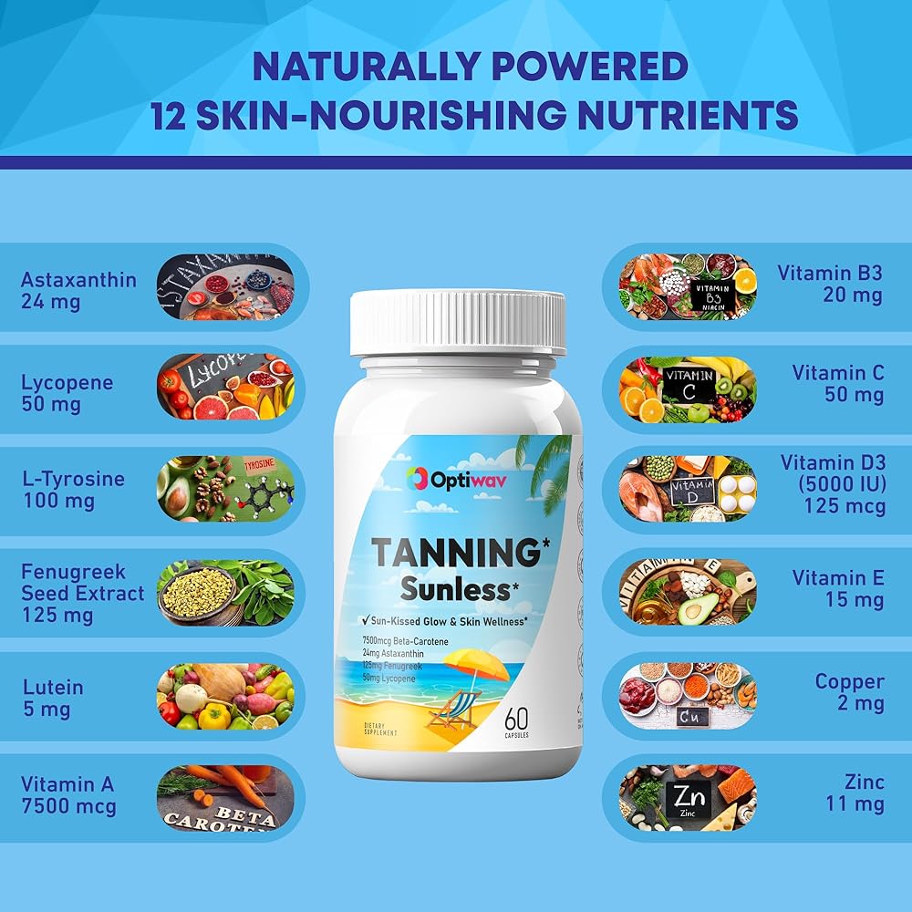 الجمال اليومي ودعم المناعة: تحتوي حبوب Optiwav Tan للرجال والنساء على الفيتامينات والمعادن بما في ذلك فيتامين C وD3 وE وB3 والزنك والنحاس. تدعم هذه العناصر الغذائية الترطيب والمرونة ولون البشرة المتوازن، بينما تساعد أيضًا في الحفاظ على وظيفة المناعة الصحية. يساعد مكمل حبوب التسمير الذاتي هذا النساء على تغذية بشرتهن من الداخل والحفاظ على توهج ذهبي مع الاستخدام اليومي المستمر.