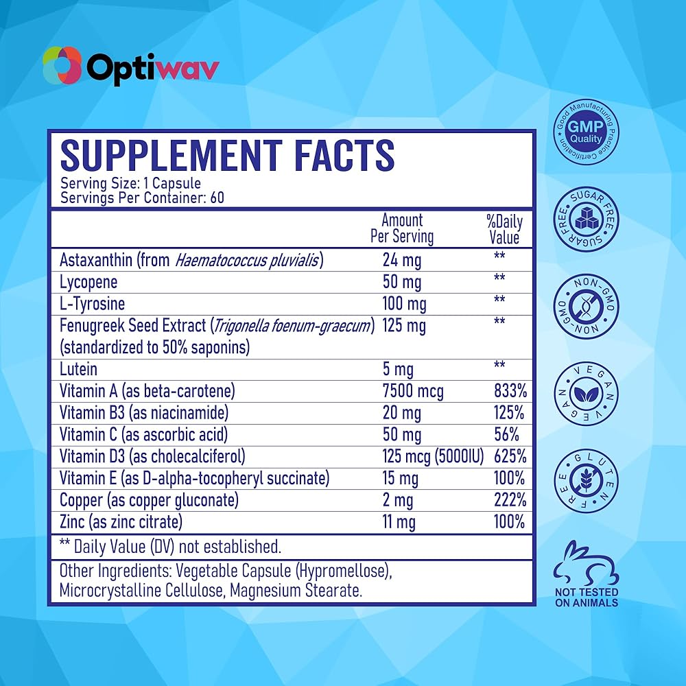 دفاع مضاد للأكسدة لدعم إشراق البشرة: يساعد أستازانتين والليكوبين ومضادات الأكسدة النباتية الأخرى في Optiwav Tanning على حماية وتغذية البشرة مع دعم مظهر ناعم ومشرق. يعمل مكمل التسمير الطبيعي هذا يوميًا لتعزيز التوهج وتحسين الوضوح ودعم صحة البشرة بشكل عام. إنه مصنوع للمساعدة في الحفاظ على المظهر البرونزي دون الاعتماد على التعرض للأشعة فوق البنفسجية.