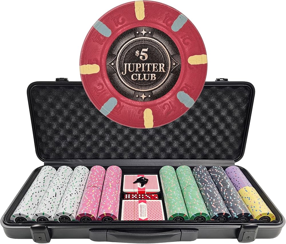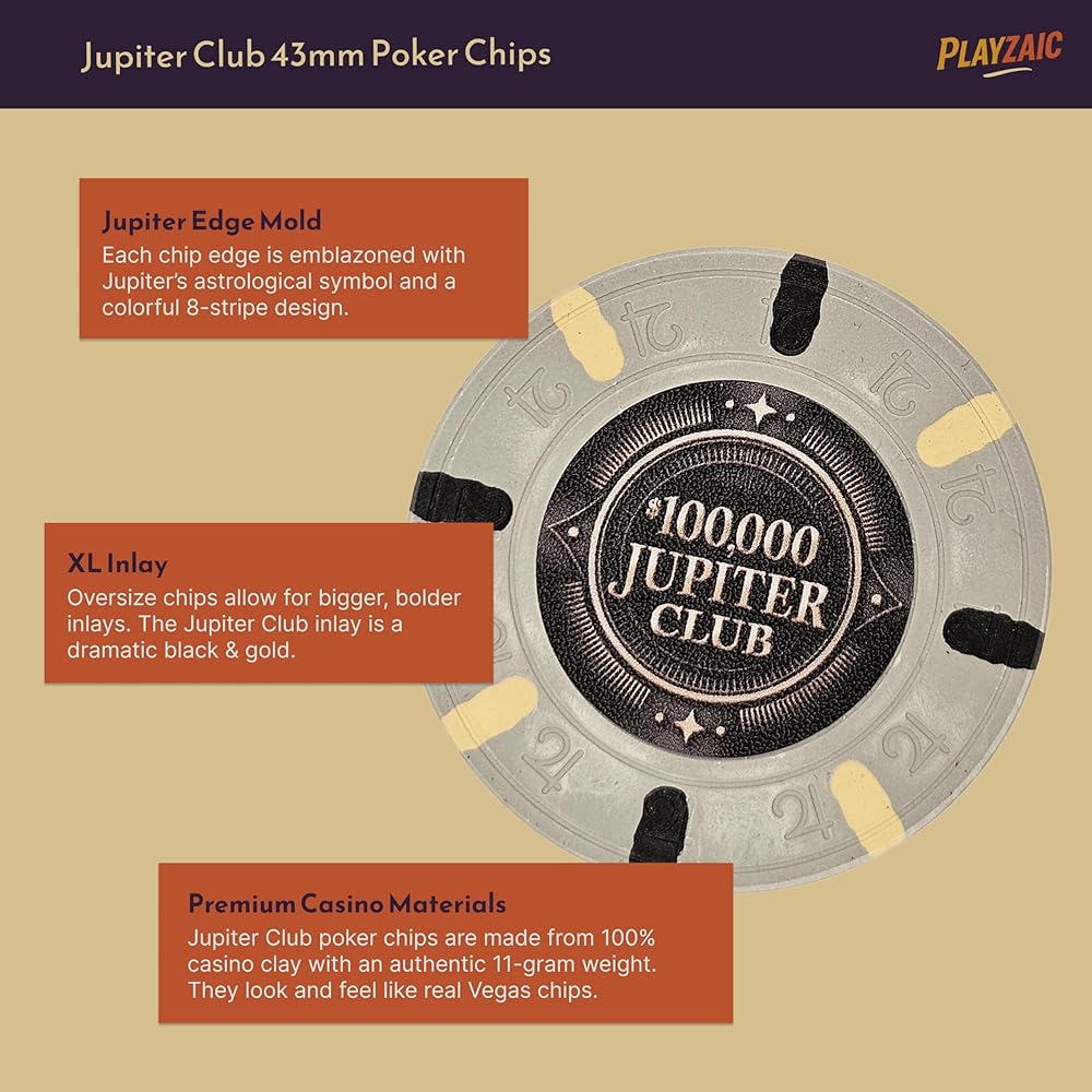 مادة طين الكازينو الحقيقية: مثل مجموعات رقائق البوكر المعمول بها في ميلانو وفينيكس، فإن رقائق بوكر Jupiter Club مصنوعة من طين الكازينو الأصلي بنسبة 100% للحصول على ملمس ترابي ووزن خفيف وصوت يتعرف عليه اللاعبون الجادون على الفور.